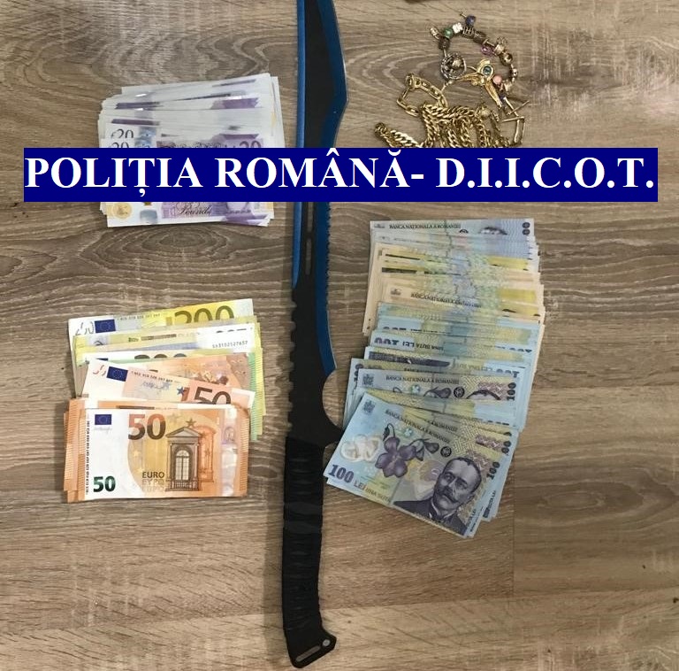 În urma perchezițiilor, au fost ridicate 2 laptopuri, o tabletă, 2 camere foto/video, 12 telefoane mobile, 20 de carduri SIM, 1 memory stick, 150 de grame de bijuterii din metal de culoare galbenă, 14.800 de lei, 1.520 de euro, 1.160 de lire sterline, cuțite, macete, securi, săbii, precum și mai multe bunuri și înscrisuri cu valoare probatorie.