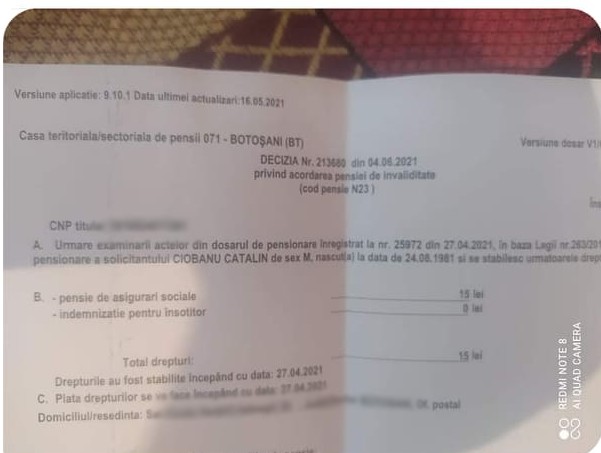 Un bărbat de 40 de ani, din județul Botoșani, tatăl a trei copii, s-a pensionat pe caz de boală, iar recent a primit mult așteptata decizie de pensionare. Cătălin Ciobanu, din localitatea Fundu Herții, a crezut că nu vede bine când a primit decizia. Doar 15 lei va primi pensie lunar de acum încolo. Adică a cheltuit mai mult cu drumurile pe care le-a făcut pentru a-și face dosarul decât va primi pensie.