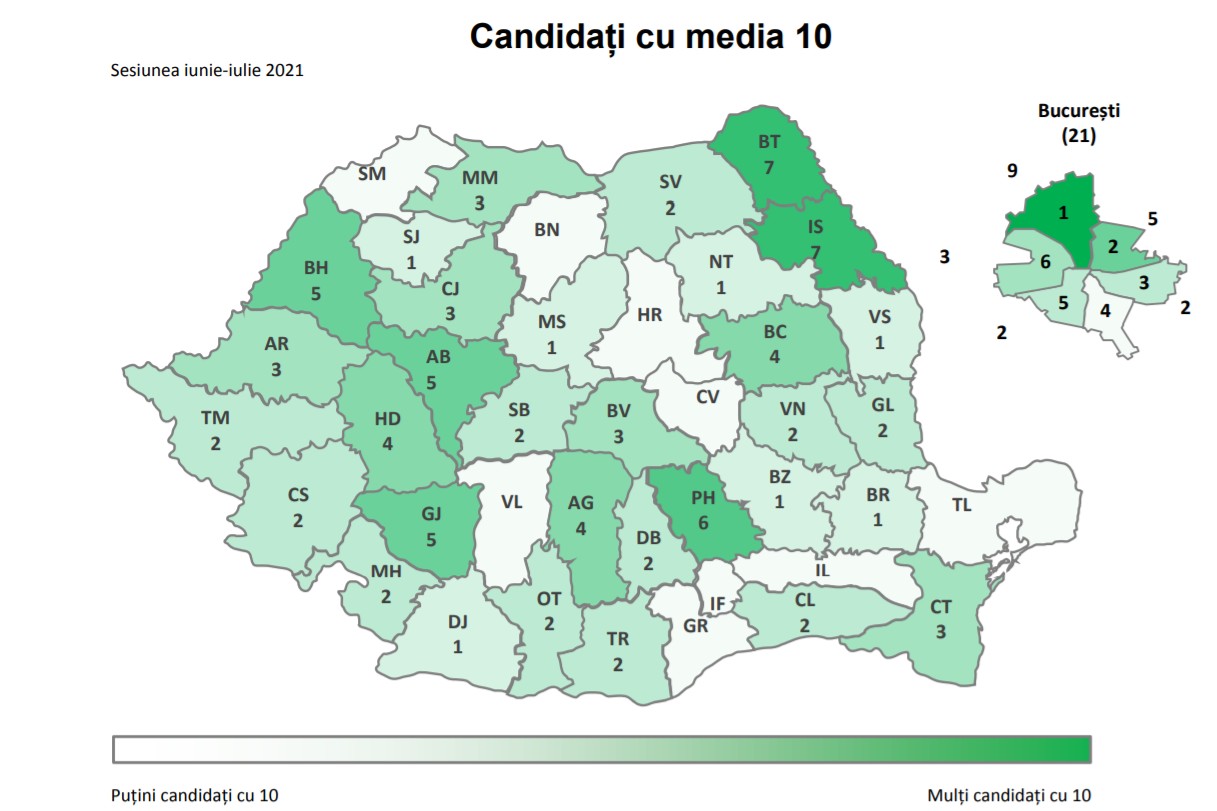 Pe discipline de examen, situația candidaților cu note de 10 este următoarea: 38 au obținut nota 10 la proba de Limba și literatura română; 85 au obținut nota 10 la proba obligatorie a profilului(Matematică – 33 / Istorie – 52); 186 au obținut nota 10 la proba la alegere a profilului și a specializării.
