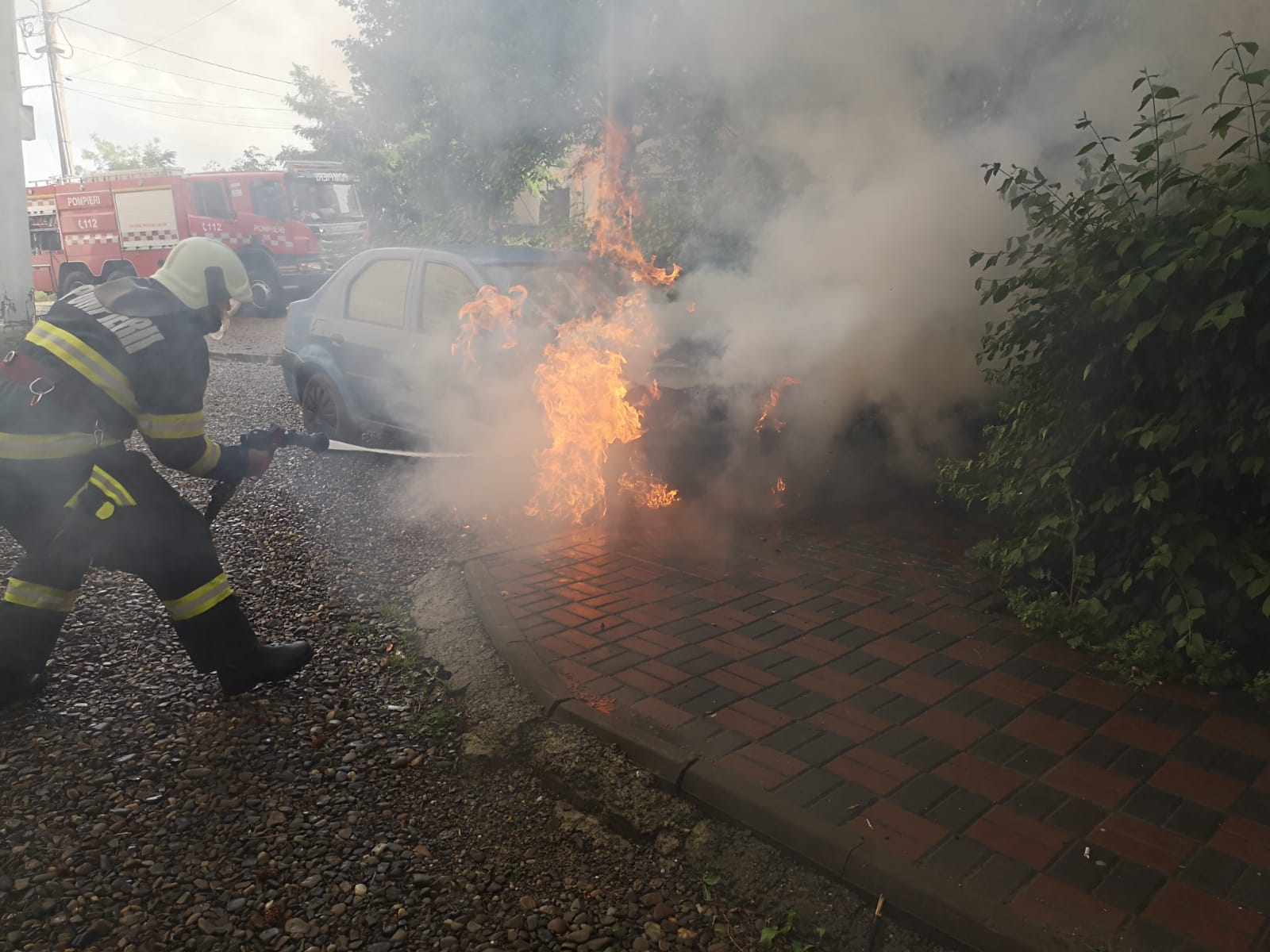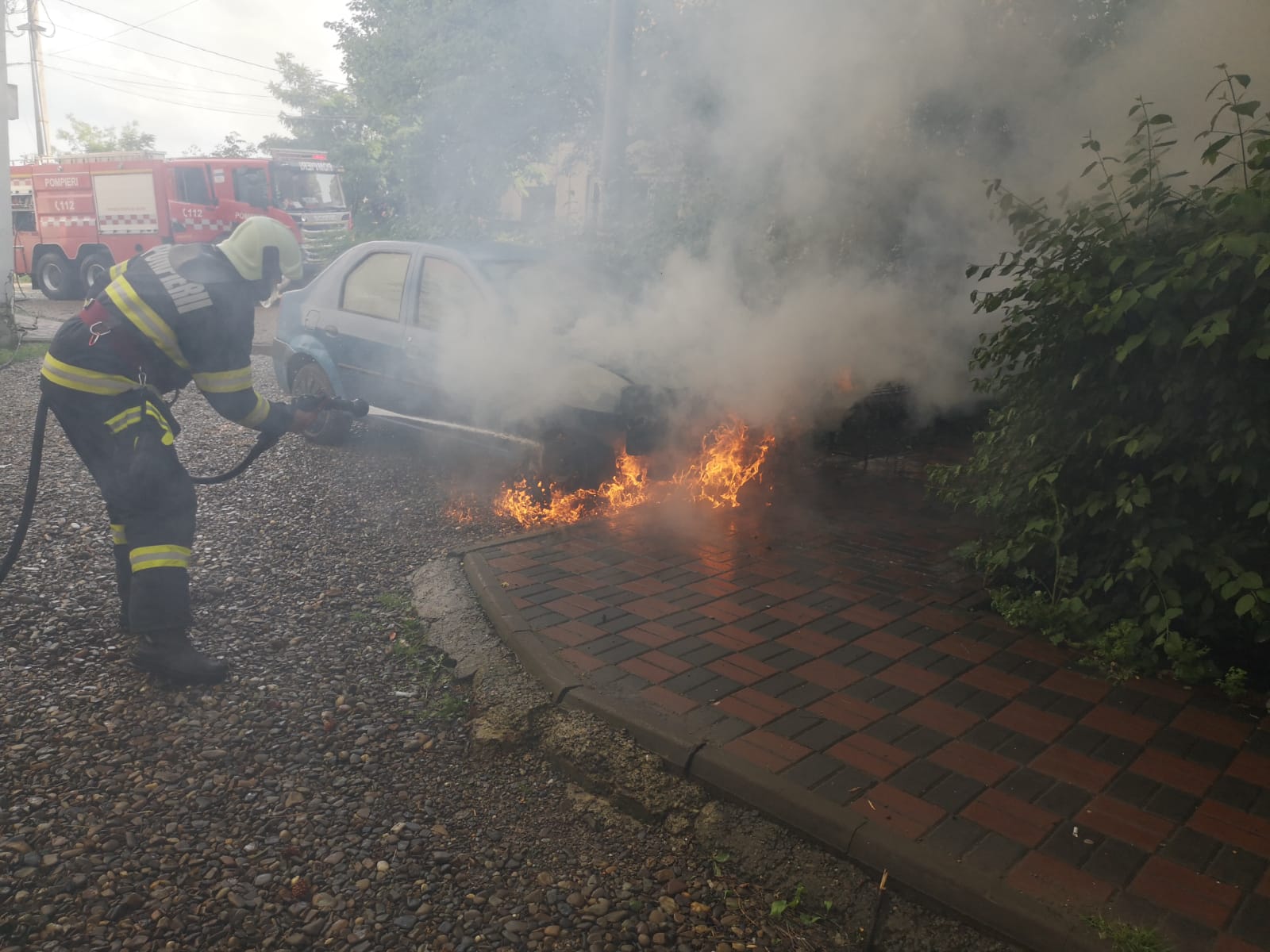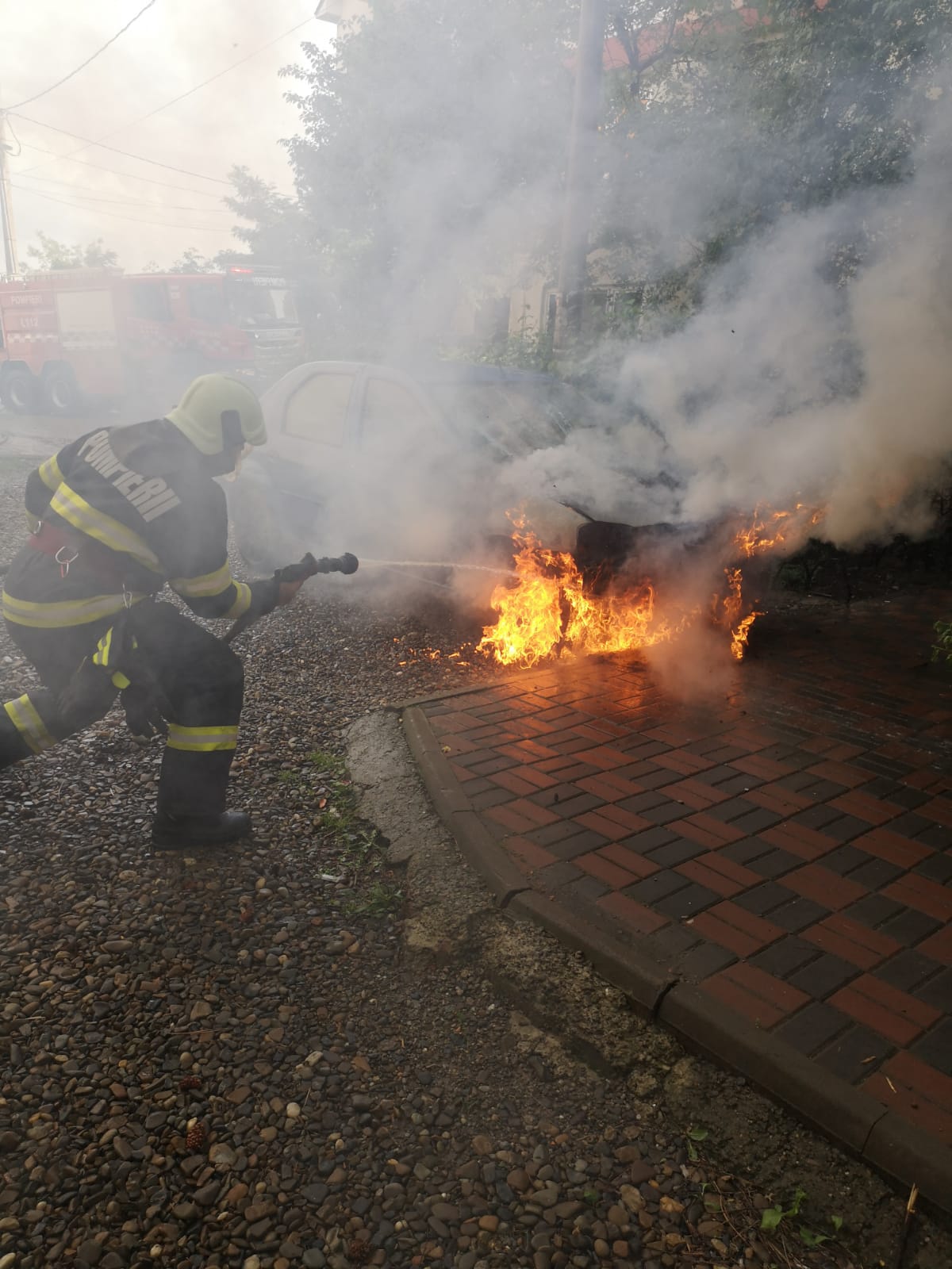 La sosirea forțelor de intervenție, ardeau elementele combustibile ale compartimentului motor, existând pericolul de propagare a flăcărilor la întregul autoturism, dar și la alte două mașini parcate în apropiere, precum și la un stâlp de iluminat stradal.