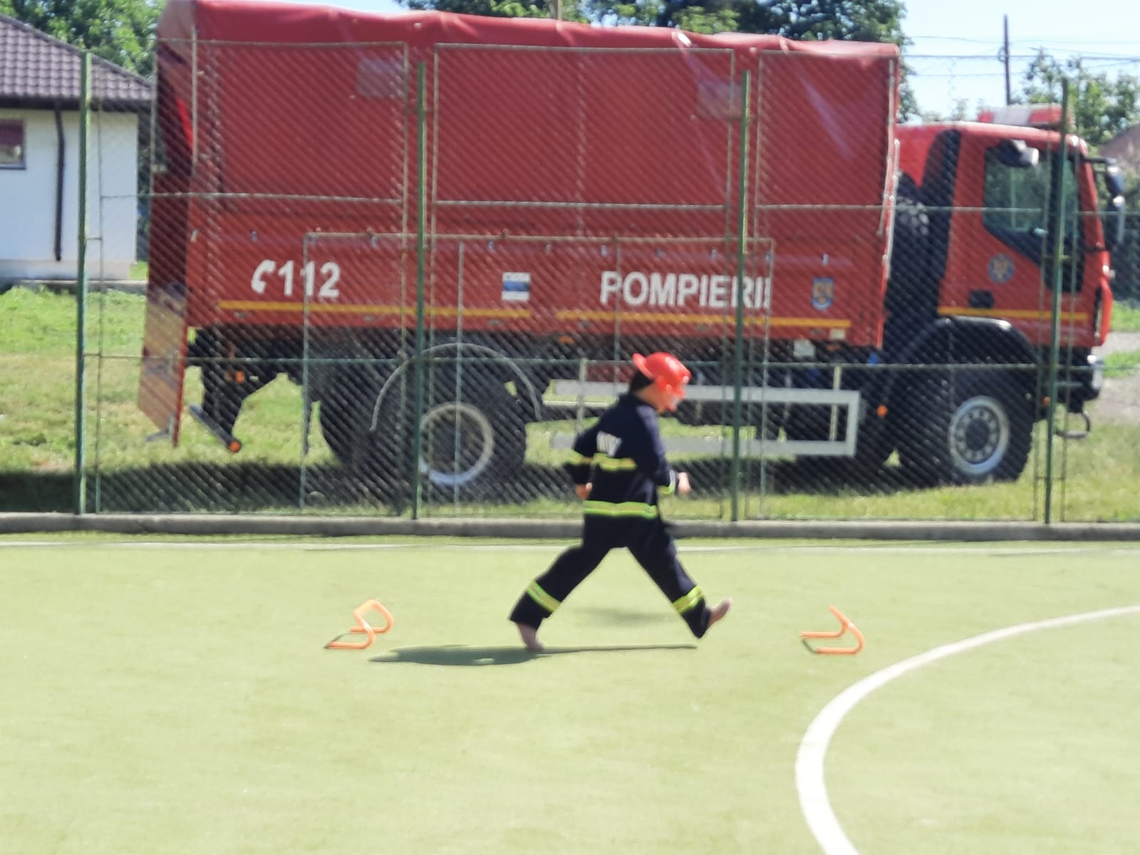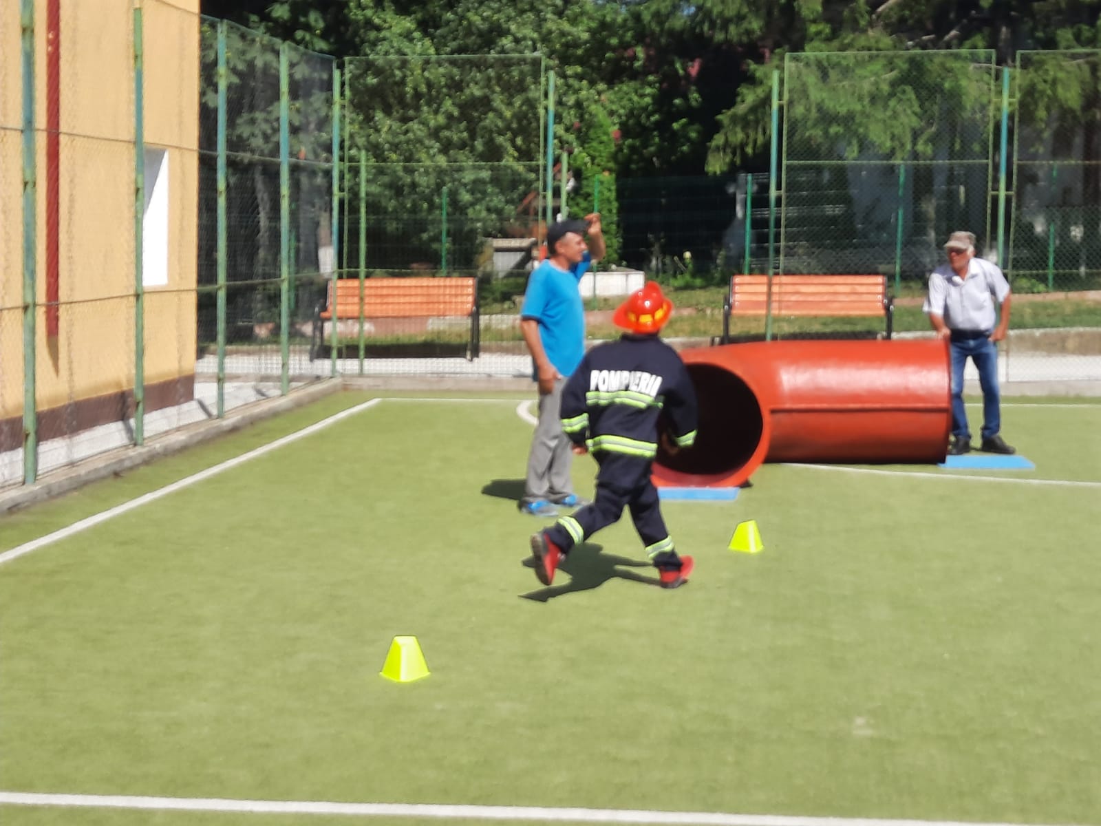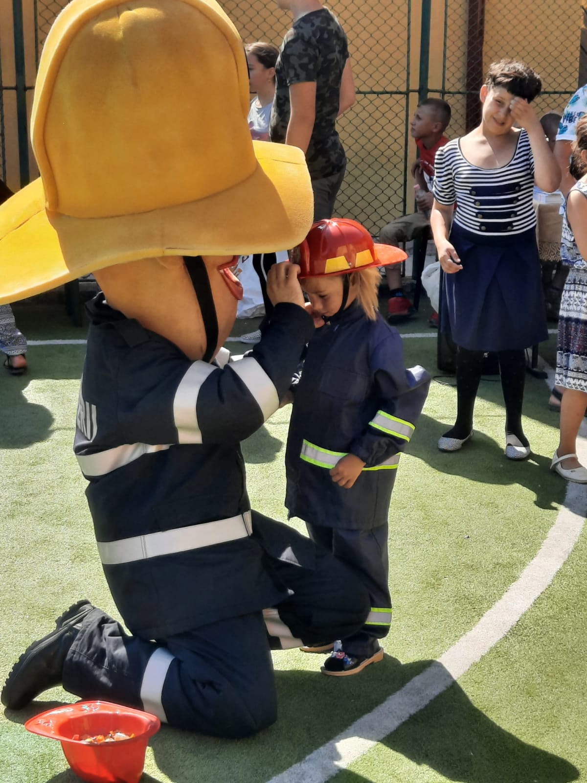 Echipați cu costume de intervenție, micii pompieri au trecut printr-un tunel, au salvat ursuleţul sau cățelul de pluș de pe tobogan, au alergat printre jaloane şi au stins un incendiu imaginar. Au fost răsplătiți cu dulciuri și multe aplauze.