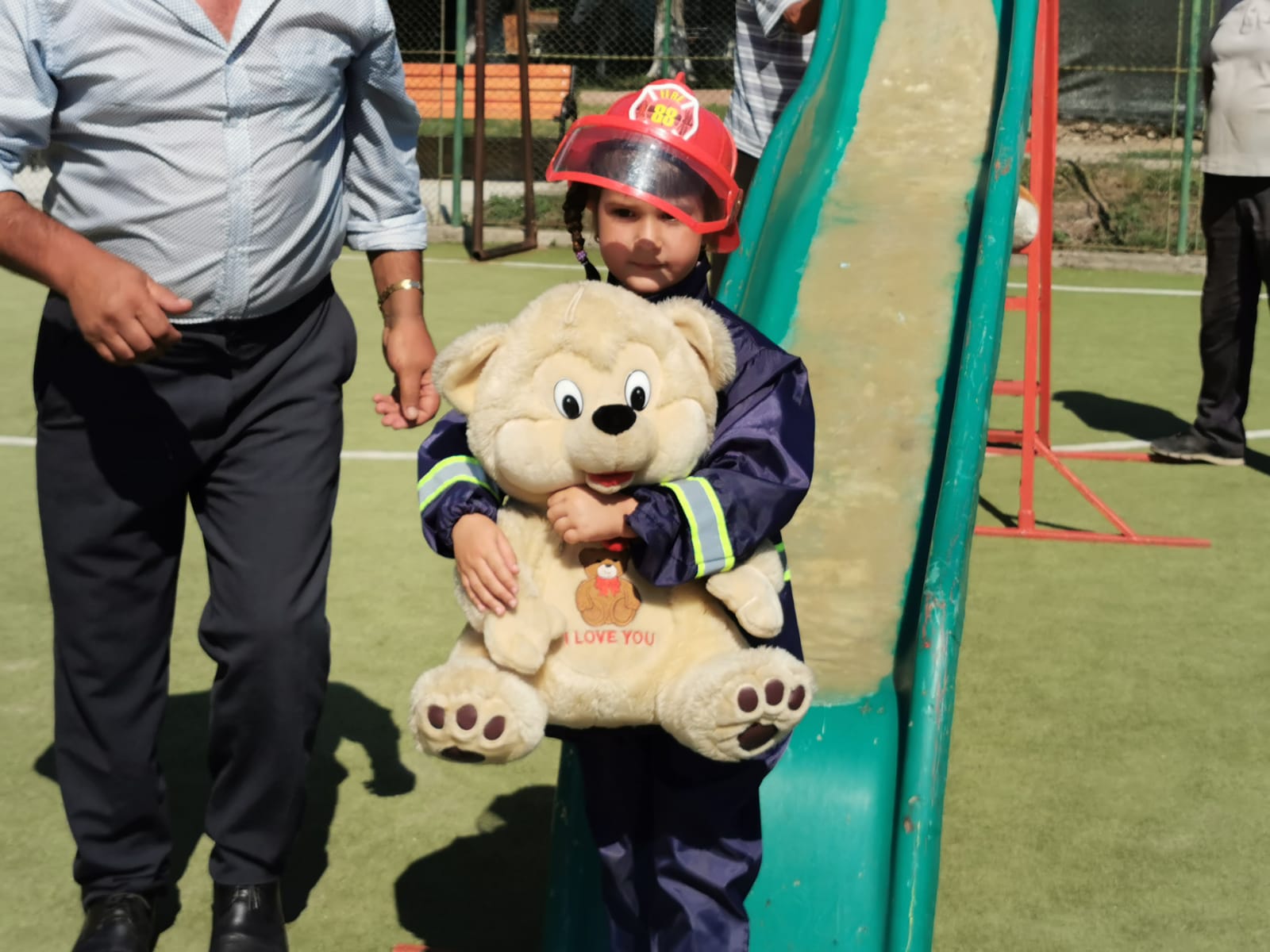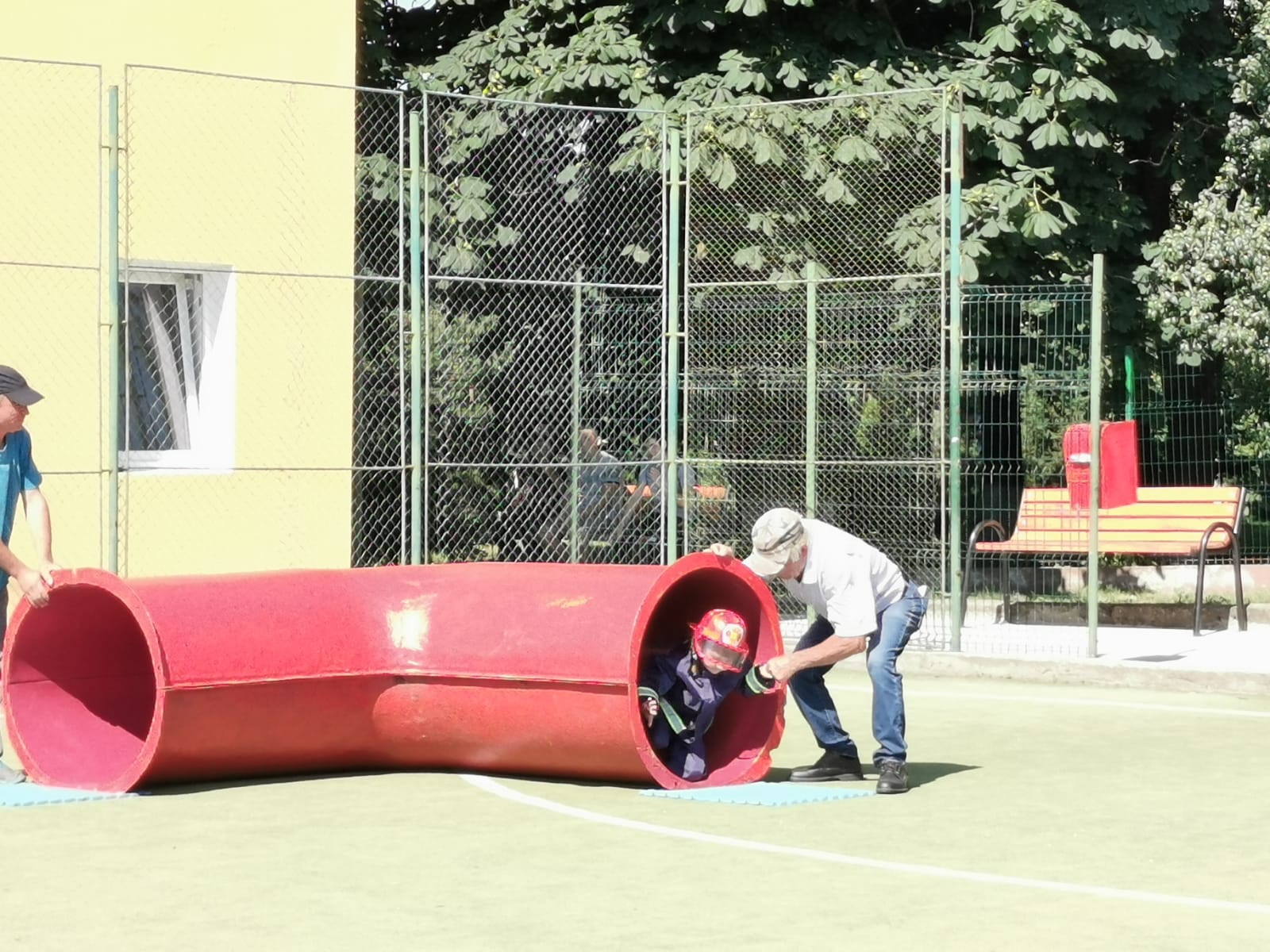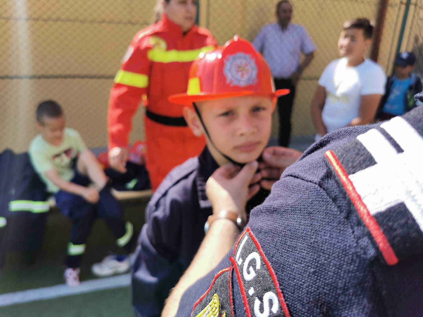 Echipați cu costume de intervenție, micii pompieri au trecut printr-un tunel, au salvat ursuleţul sau cățelul de pluș de pe tobogan, au alergat printre jaloane şi au stins un incendiu imaginar. Au fost răsplătiți cu dulciuri și multe aplauze.