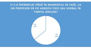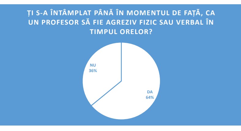 La întrebarea „Ți s-a întâmplat până în momentul de față, ca un profesor să fie agresiv fizic sau verbal în timpul orelor?” 64% (130 de respondenți) au răspuns afirmativ, în timp ce 36% (73 de respondenți) au spus că nu.