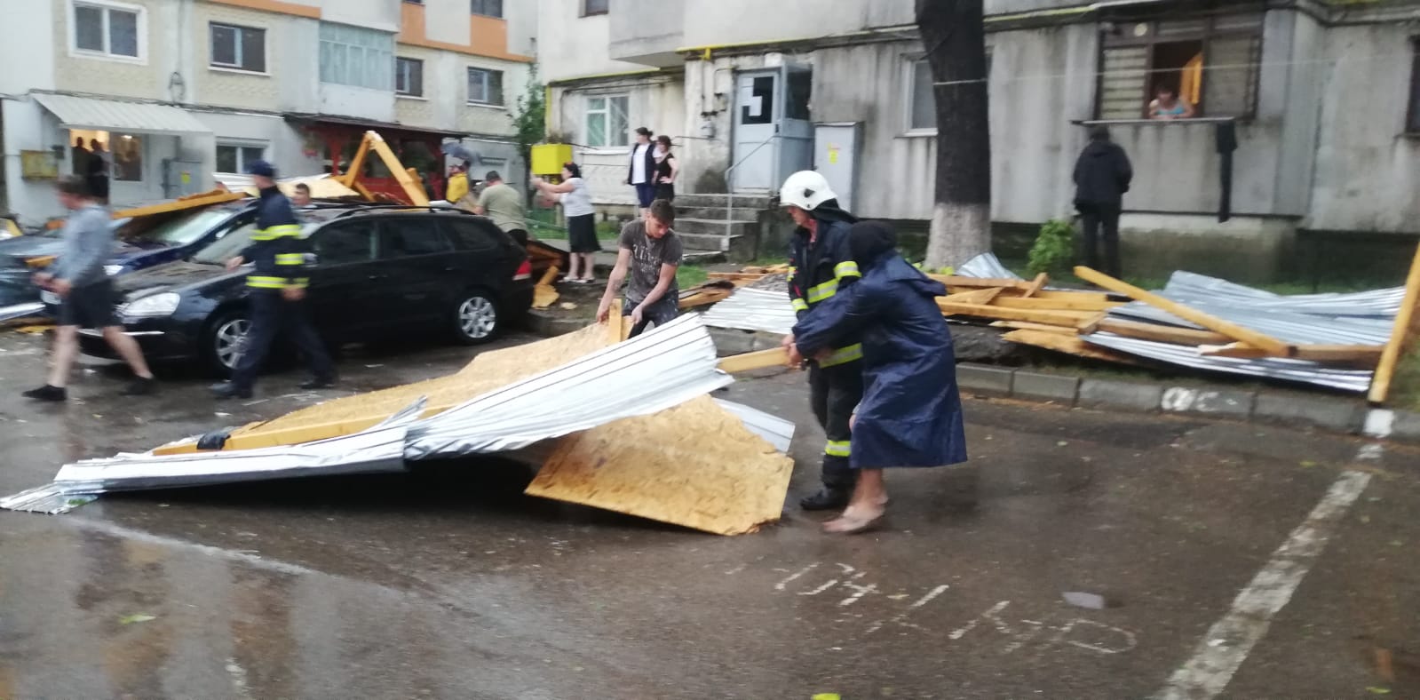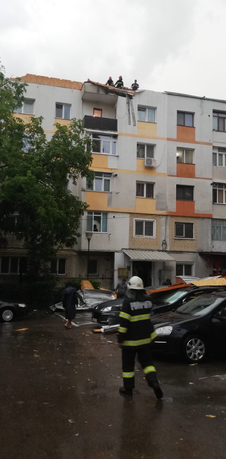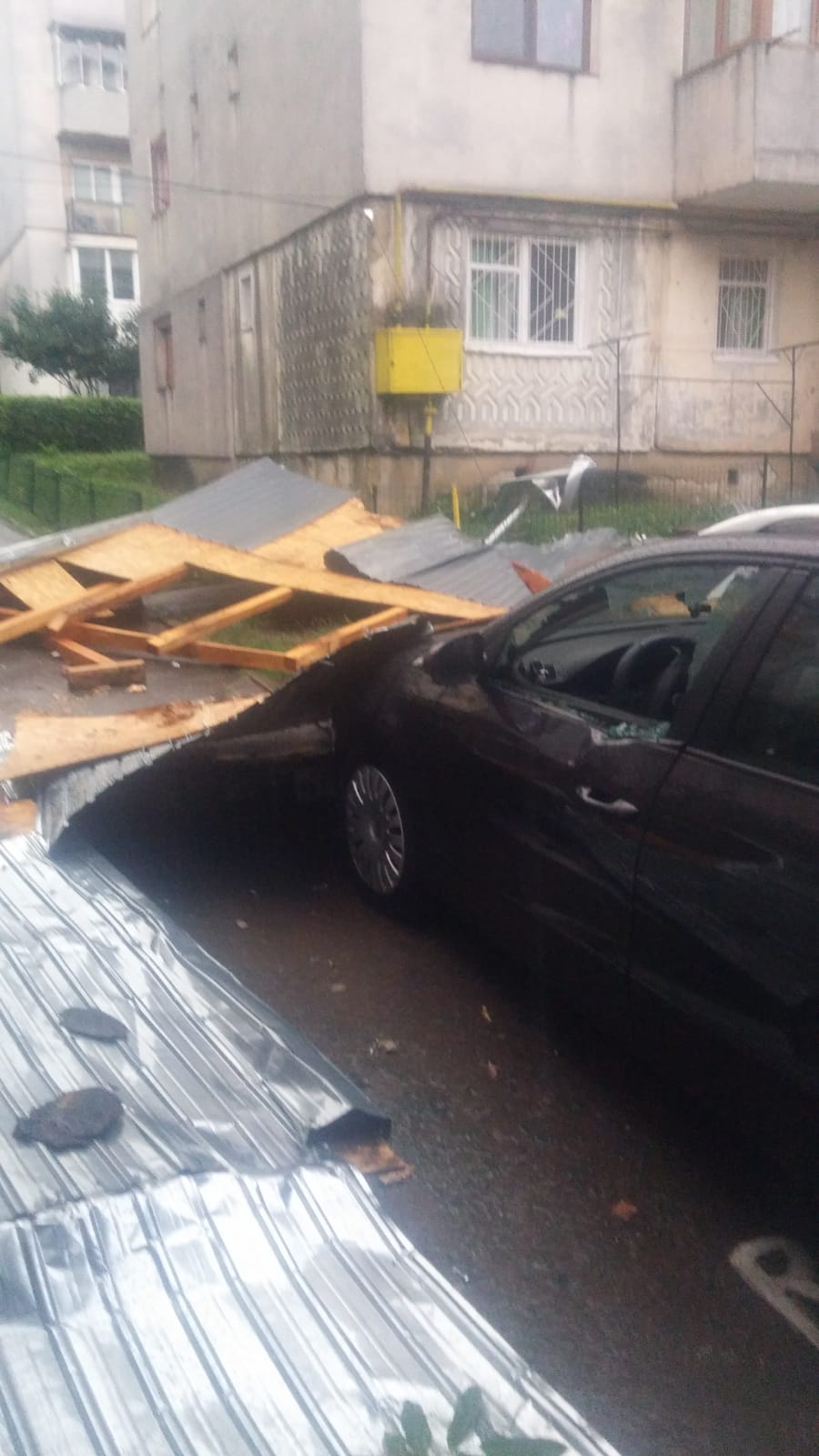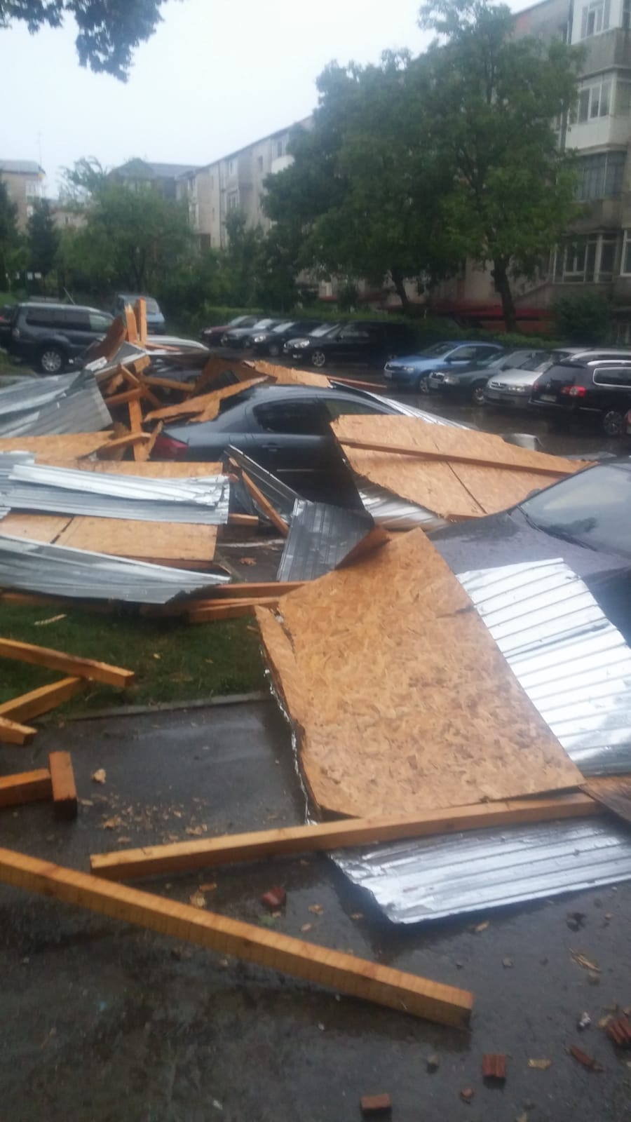Furtuna a făcut dezastru, miercuri seară, la Botoșani! O șarpantă smulsă de vânt de pe un bloc și un copac doborât de vijelii au căzut peste niște mașini.