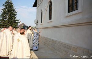 După întâmpinarea ierarhului, soborul dimpreună cu cei prezenți au înconjurat sfântul locaș, iar în continuare, potrivit rânduielilor bisericești, IPS Teofan a sfințit și pecetluit Sfânta Masă din Sfântul Altar și a binecuvântat pictura interioară prin stropire cu apă sfințită și prin ungere cu Sfântul și Marele Mir. După oficierea slujbei de sfințire, clericii au săvârșit Sfânta Liturghie pe un podium special amenajat în curtea parohiei, iar credincioșii au așteptat la rând pentru a se închina în altar.