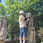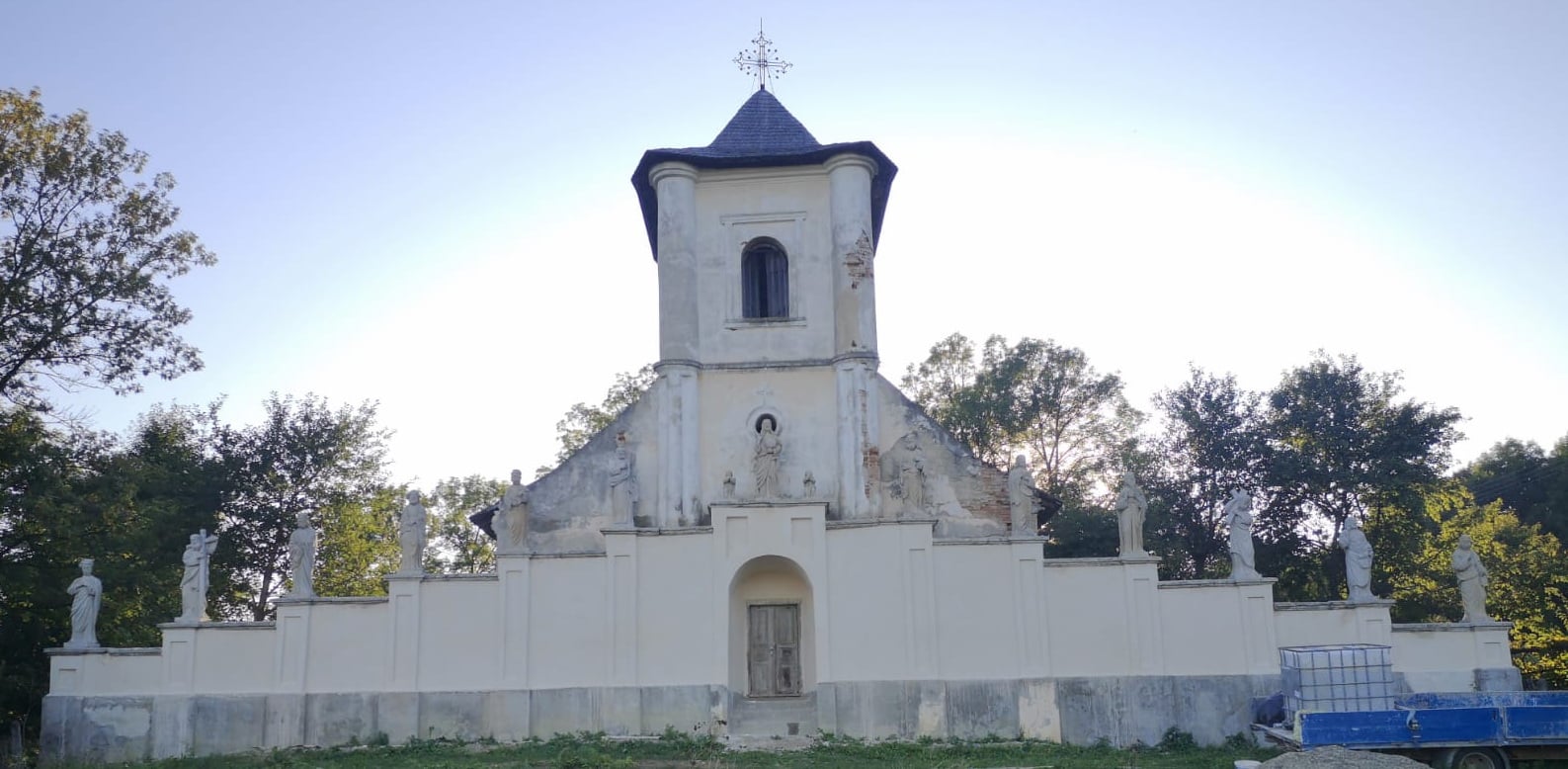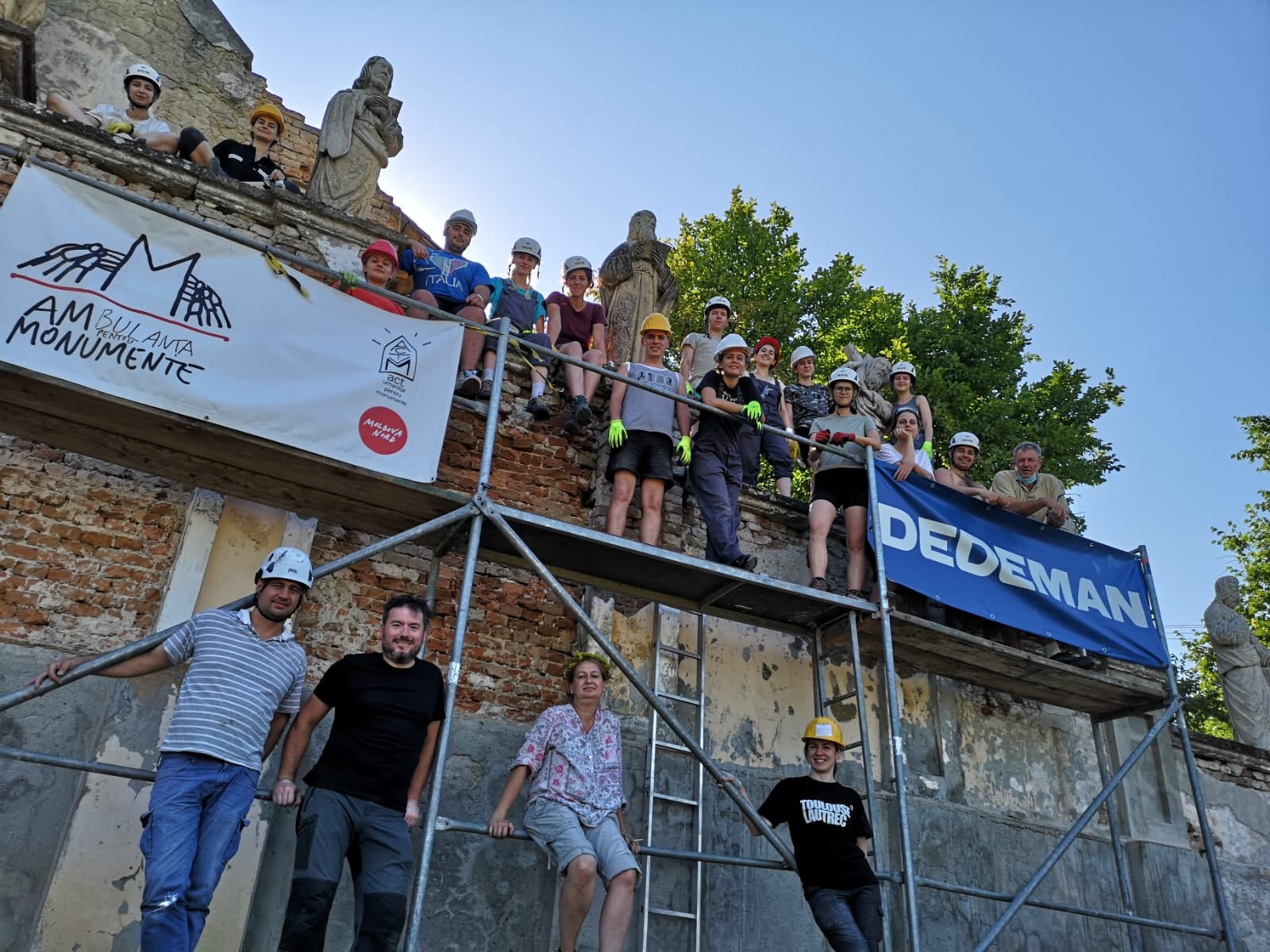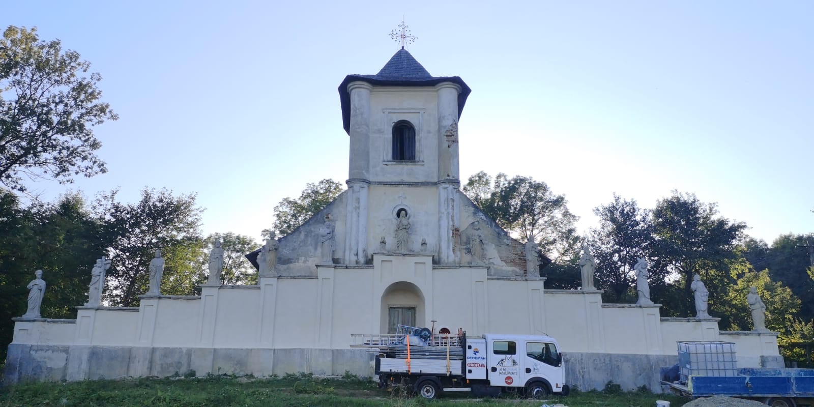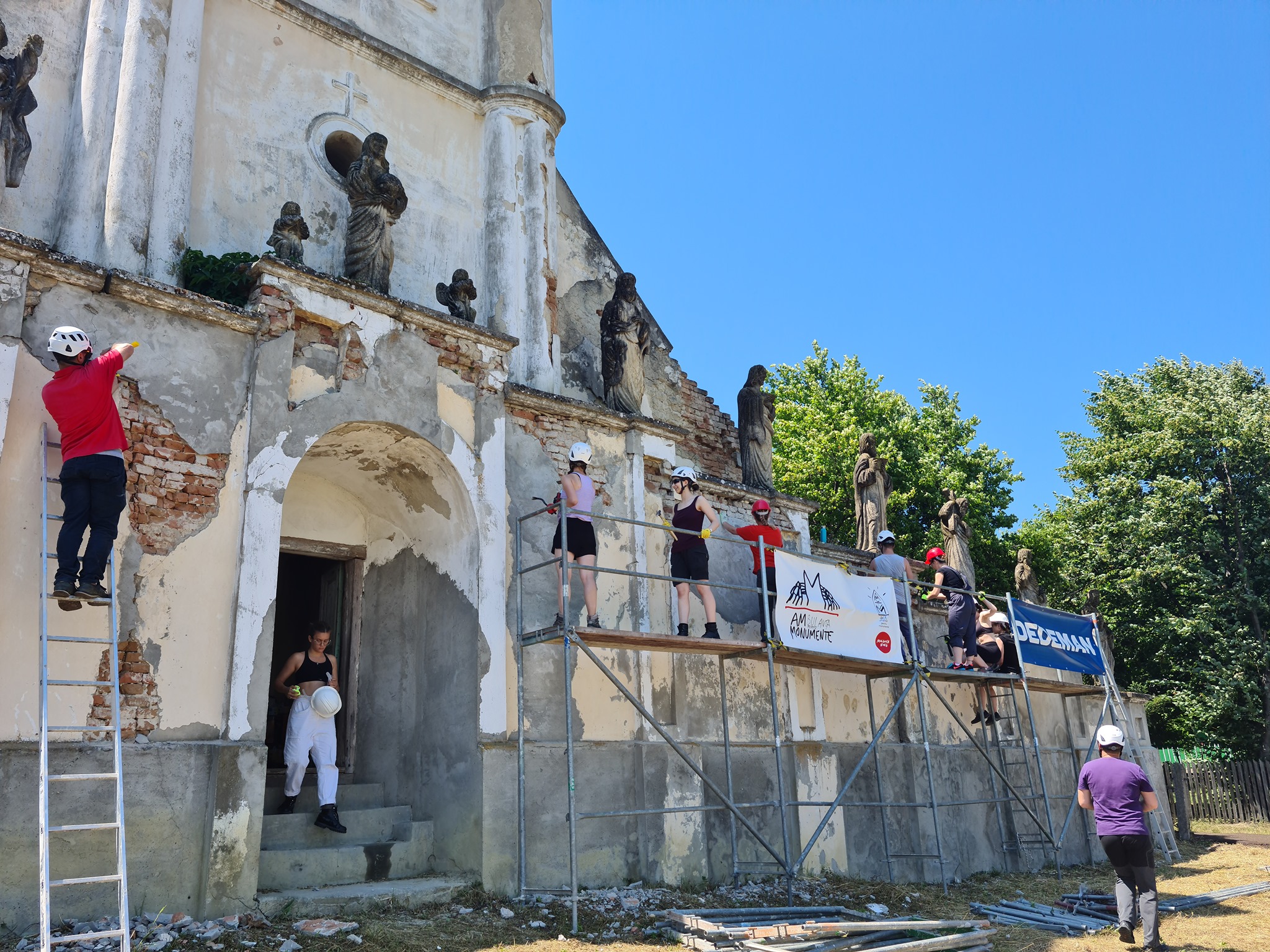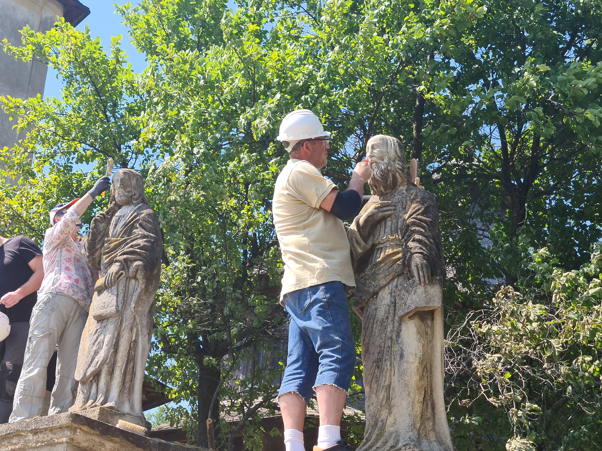 „Astfel, am îndepărtat tencuiala din mortar de ciment de pe laturile de sud, est și nord ale zidului, după care am făcut injectări în masa zidăriei, în zonele sensibile, cu mortar fluid de var hidraulic, urmând apoi rezidiri punctuale cu cărămidă plină și rostuiri. Paramentul zidului a fost finisat cu tencuială și tinci pe bază de var hidraulic. Împreună cu restauratorii ce ni s-au alăturat, am biocidat și am îndepărtat depunerile biologice de pe statuile și de pe coronamentul din piatră, cu instrumentar adecvat. Întrucât statuile vor rămâne în continuare expuse intemperiilor, iar acestea prezentau exfolieri parțiale și demineralizări ale pietrei, ele au fost la final tratate preventiv cu o soluție de restaurare pe bază de etil-silicați. Astfel, am prelungit perioada în care pot aștepta o intervenție majoră de restaurare. Cu ocazia îndepărtării lichenilor de pe suprafaţa statuilor, am descoperit inscripţii cu caractere latine la nivelul soclurilor, păstrate parţial, cu ajutorul cărora a fost posibilă identificarea tuturor personajelor. Mai mult, patru dintre aceste statui prezintă orificii de inserţie a unor elemente metalice, dispărute astăzi, fiind vorba de atributele iconografice ale Apostolilor”, susțin cei de la Ambulanța pentru Monumente.