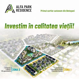 ALFA PARK Residence va îmbina confortul cu natura pe toată suprafața, integrând 46 de case și 848 de apartamente, cu spații comune de agrement și spații de servicii, cu toate facilitățile extinse de care are nevoie un complex rezidențial bine structurat, pentru a crea cartierul cu cei mai buni indicatori de calitate a vieții din Botoșani.
