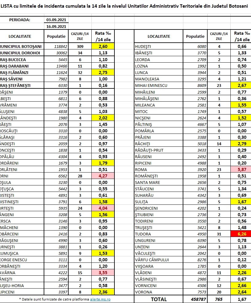 Potrivit DSP, cinci comune sunt în zonă roșie, cea mai mare incidență înregistrându-se la Tudora-6,26 la mia de locuitori, Roma-5,87 la mie, Corni-4,27 la mie, Curtești-4,04 la mie și Havârna 3,55 la mie. Municipiul Botoșani are o incidență de 2,60 la mie, iar rata de contaminare în județ este de 1,67 la mie. De asemenea, 16 localități sunt în zonă galbenă.