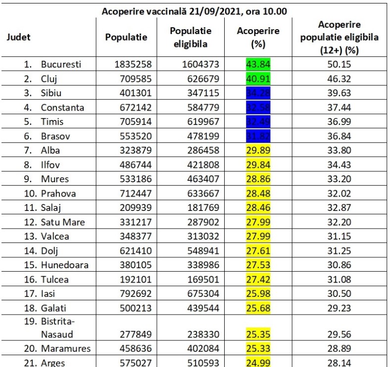 Dacă raportăm acoperirea vaccinală la populaţia eligibilă care poate primi vaccinul anti-COVID, care începe de cu vârsta de 12 ani, Capitala are singura rată de vaccinare care depăşeşte 50%, în vreme ce judeţul Cluj raportează o rată de 46,32%. Judeţul Suceava este cel mai slab în topul vaccinării: doar 16,45% din populaţia totală a judeţului, respectiv 19,35% din populaţia eligibilă s-a vaccinat anti-COVID.