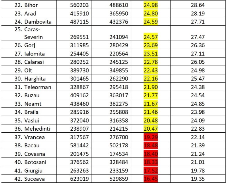Raportat la populaţia totală, şase judeţe din România au o rată de vaccinare cuprinsă între 16 şi 19%, iar alte 30 de judeţe au o acoperire vaccinală mai mică de 30%. Doar patru judeţe au o acoperire vaccinală de peste 30%, iar Capitala şi judeţul Cluj au o acoperire vaccinală de peste 40%, arată datele jurnaliștilor de la  Newsweek România, obținute de la Comitetul de Coordonare a Activităţilor privind Vaccinarea (CNCAV).