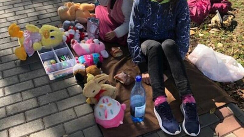 Fetițele stau pe o pătură întinsă pe trotuarul din fața Colegiului Roman Vodă, pe care și-au pus jucăriile și creioanele de colorat primite la începerea școlii. Își feresc ochii și este evident că le e foarte rușine de ceea ce fac. Cea mare plânge deja când trebuie să explice de ce face asta.