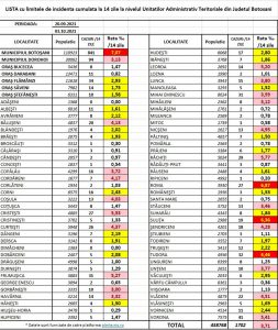 Municipiul Botoșani are cea mai mare rată de infectare COVID din județ, potrivit datelor furnizate de Direcția de Sănătate Publică Botoșani. Astfel, incidența în municipiul reședință de județ a ajuns la 7,07 la mia de locuitori. Pragul de 6 la mie a mai fost depășit, pe lângă Tudora-6,49, Roma-6,87 și de comuna Sulița, unde rata de infectare a ajuns la 6,36.