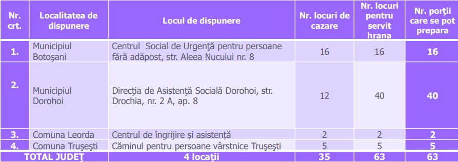 Astfel, oamenii străzii vor fi găzduiți în centrele Direcției Generale de Asistență Socială și Protecția Copilului, dar și în spații ale administrațiilor locale din municipiile Botoșani (Centrul Social de Urgenţă pentru persoane fără adăpost) și Dorohoi (Direcţia de Asistenţă Socială Dorohoi).