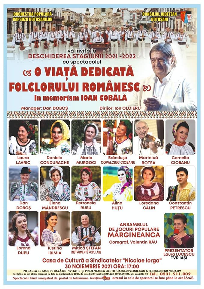 Un spectacol în memoria maestrului Ioan Cobâlă va avea loc pe 30 noiembrie, de la ora 17.00, la deschiderea stagiunii 2021- 2022 a Orchestrei Populare Rapsozii Botoșanilor. „O viață dedicată foclorului românesc”, este un spectacol in memoriam Ioan Cobâlă, iar pe scenă vor urca artiști renumiți precum Laura Lavric, Daniela Condurache, Cornelia Ciobanu, Dan Doboș, dar și mulți alții.