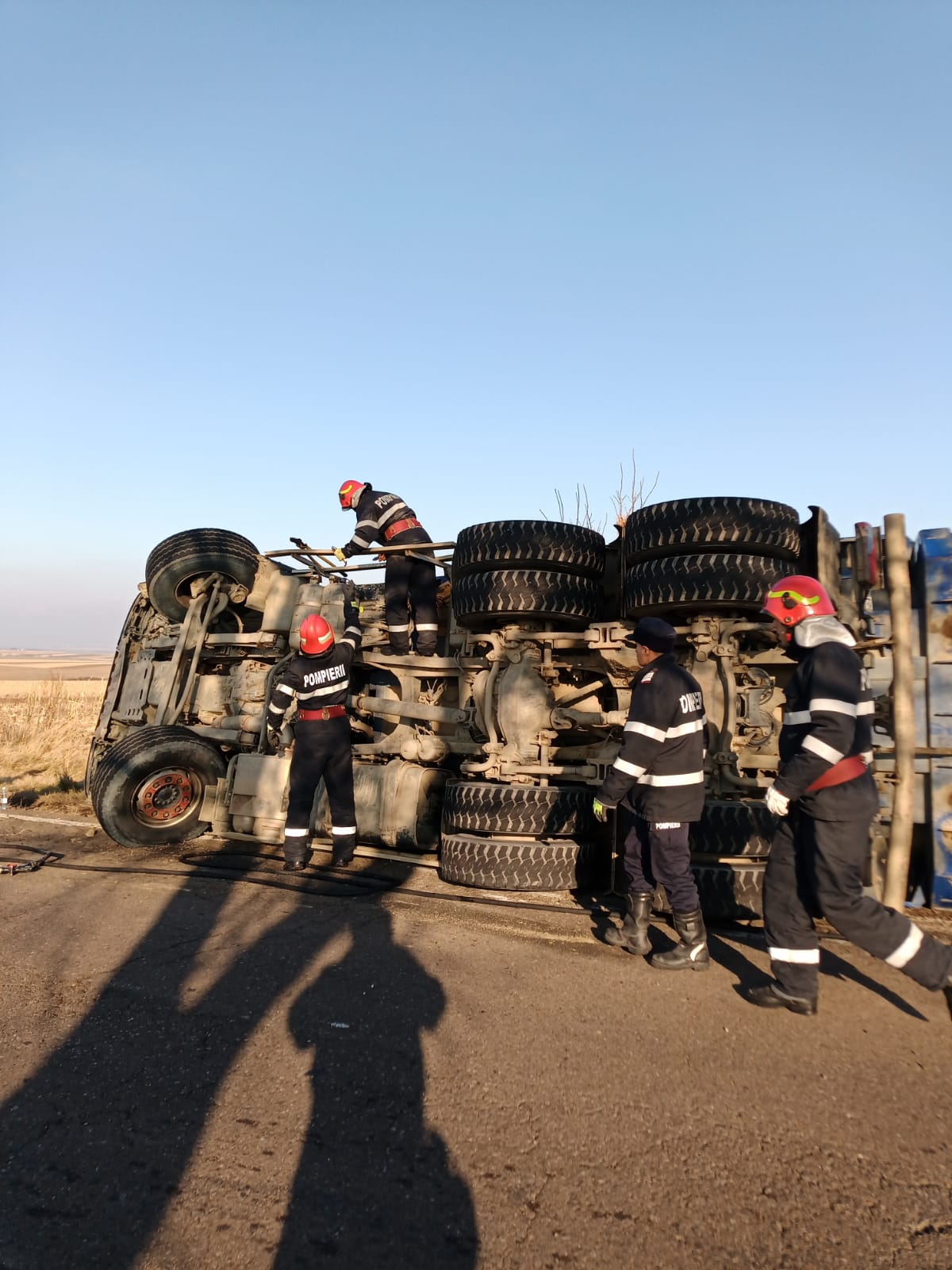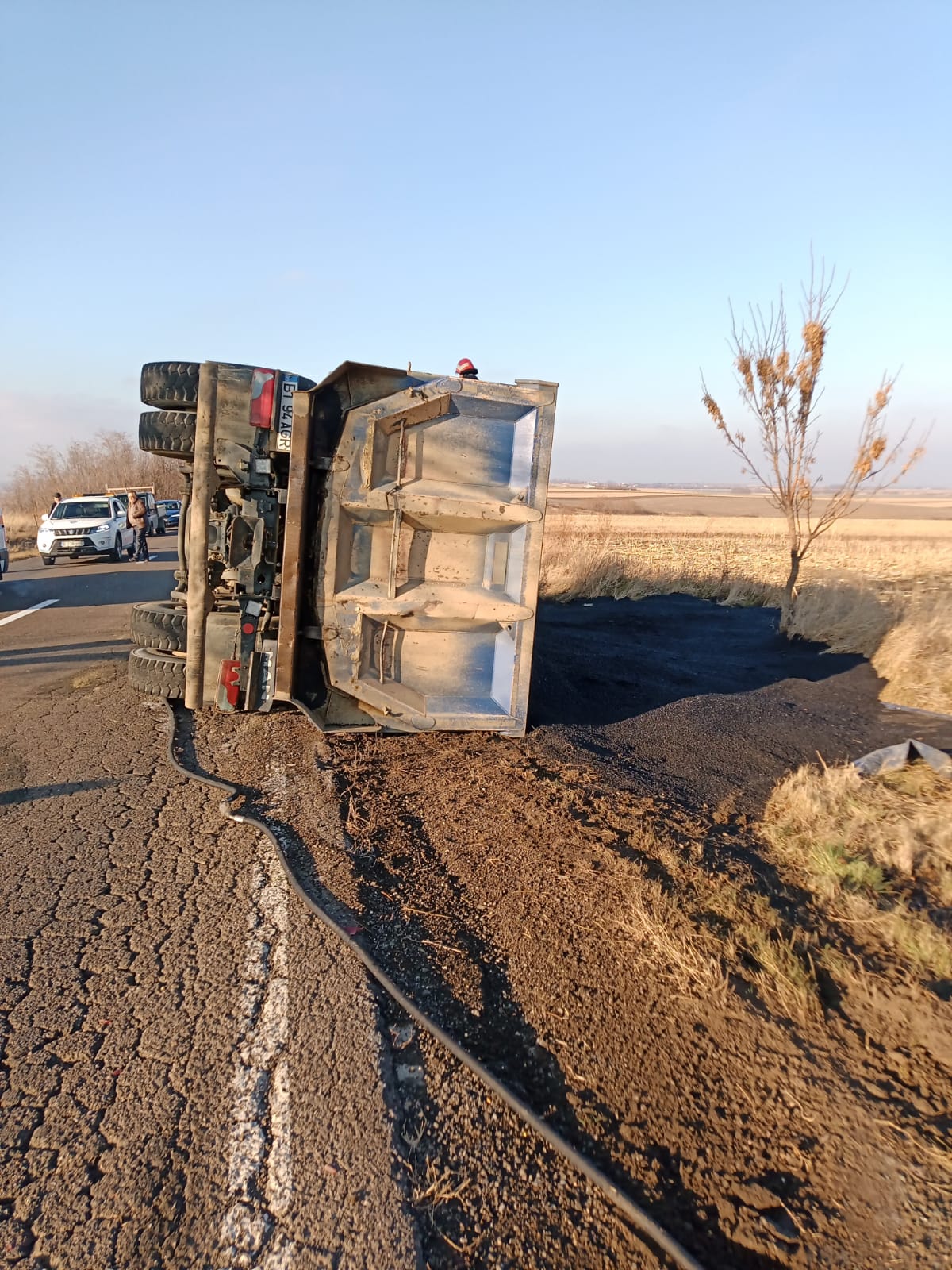 Pompierii au asigurat și măsurile PSI la locul evenimentului rutier. Camionul era încărcat cu bitum.