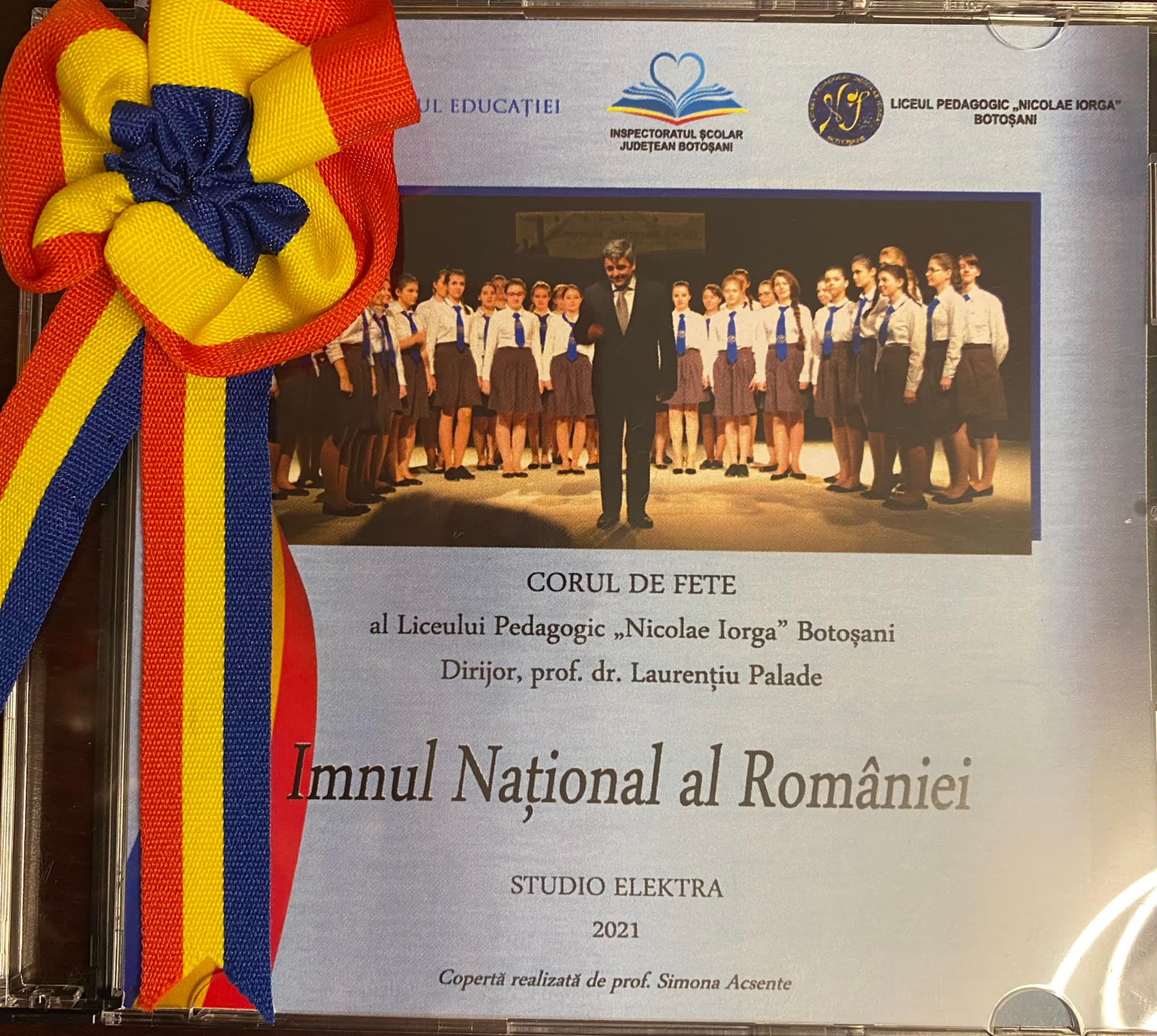 Corul de fete al Liceului Pedagogic „Nicolae Iorga” din Botoșani, condus de profesorul Laurențiu Palade, a oferit, pentru Ziua Națională a României, tuturor unităților de învățământ din județ și tuturor instituțiilor statului, aproape 200 de CD-uri, cu o înregistrare excepțională a imnului României.