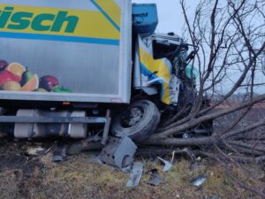 Un accident rutier a avut loc, marți dimineață, pe drumul național DN 29A, în extravilanul municipiul Dorohoi. Un camion a părăsit partea carosabilă, izbindu-se frontal de un copac pe care l-a rupt.