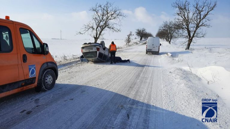 Accident cu trei victime la Botoșani. Un autoturism a intrat într-un mal de pământ, după care s-a răsturnat pe cupolă