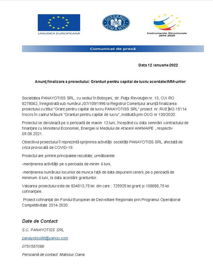 Societatea PANAYOTISS SRL, cu sediul în Botoşani, str. Piaţa Revoluţiei nr. 13, CUI RO 8278062, înregistrată sub numărul J07/109/1996 la Registrul Comerțului anunță finalizarea proiectului cu titlul ”Grant pentru capital de lucru PANAYOTISS SRL” proiect nr. RUE M2-15114 înscris în cadrul Măsurii ”Granturi pentru capital de lucru”, instituită prin OUG nr 130/2020.