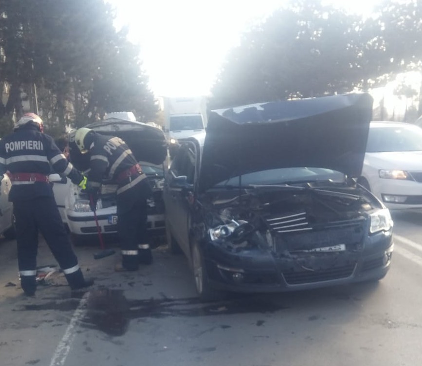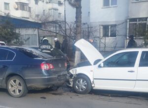 În urma impactului mașinile au fost puternic avariate. Polițiștii fac cercetări pentru a stabili cauza exactă a accidentului.