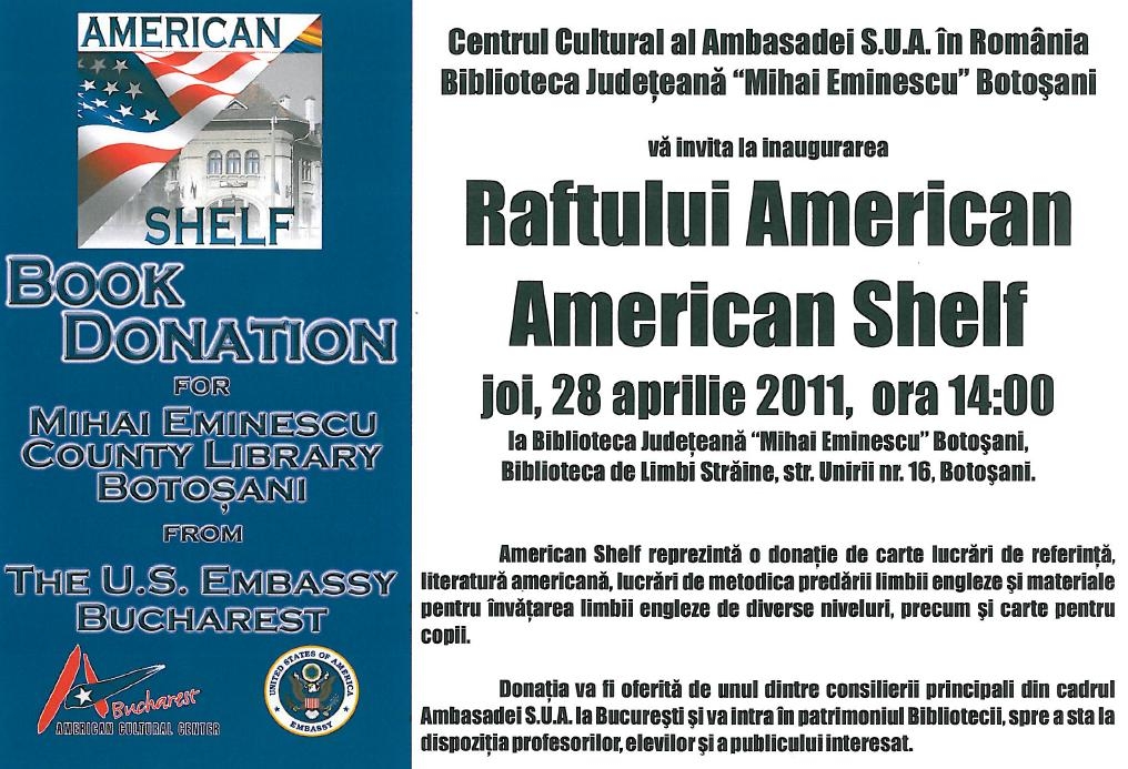 Centrul Cultural al Ambasadei S.U.A. la Bucureşti şi Biblioteca Judeţeană “Mihai Eminescu” Botoşani au plăcerea de a vă invita la inaugurarea Raftului American (American Shelf). Evenimentul va avea loc joi, 28 aprilie 2011, de la ora 14:00, la Biblioteca Judeţeană “Mihai Eminescu”, Filiala Limbi Străine, Str. Unirii nr. 16, Botoşani.