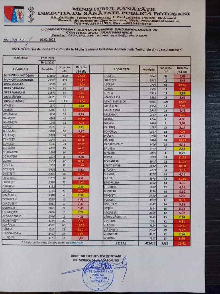 În scenariu roșu sunt mai multe localități din județul nostru, inclusiv municipiul Dorohoi, cu o rată de infectare de 11,77, Bucecea (12,04), Flămânzi (8,46), Săveni (9,85), Ștefănești (18,06).