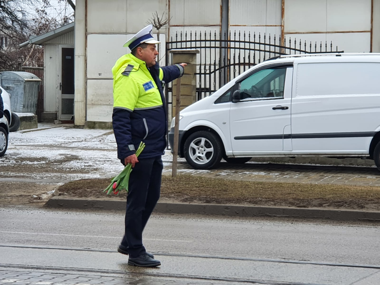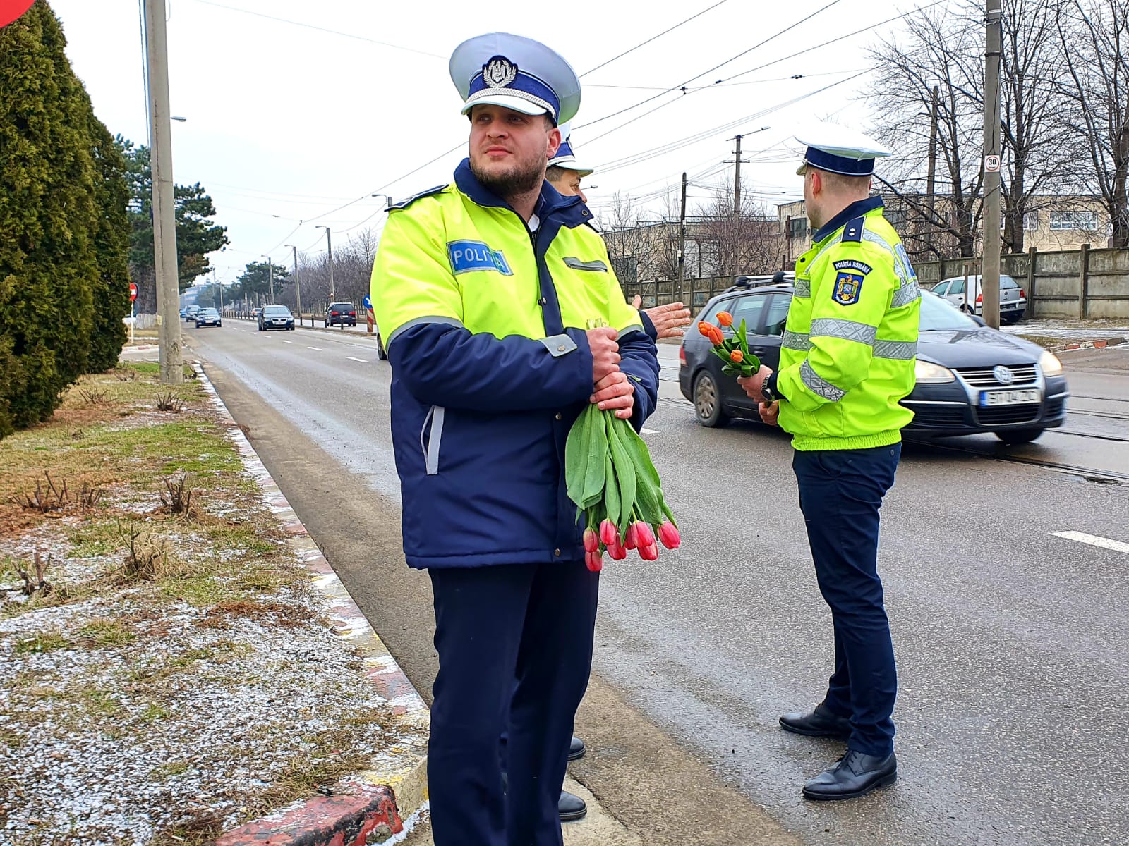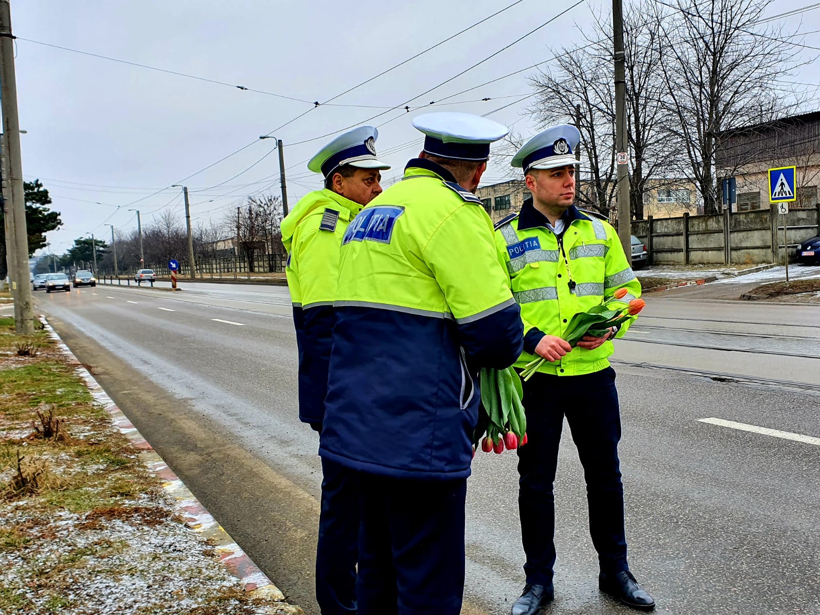 Având în vedere că este 8 Martie - Ziua Femeii, pe lângă sfaturi preventive și recomandări, polițiștii au oferit flori doamnelor și domnișoarelor participante la traficul rutier.