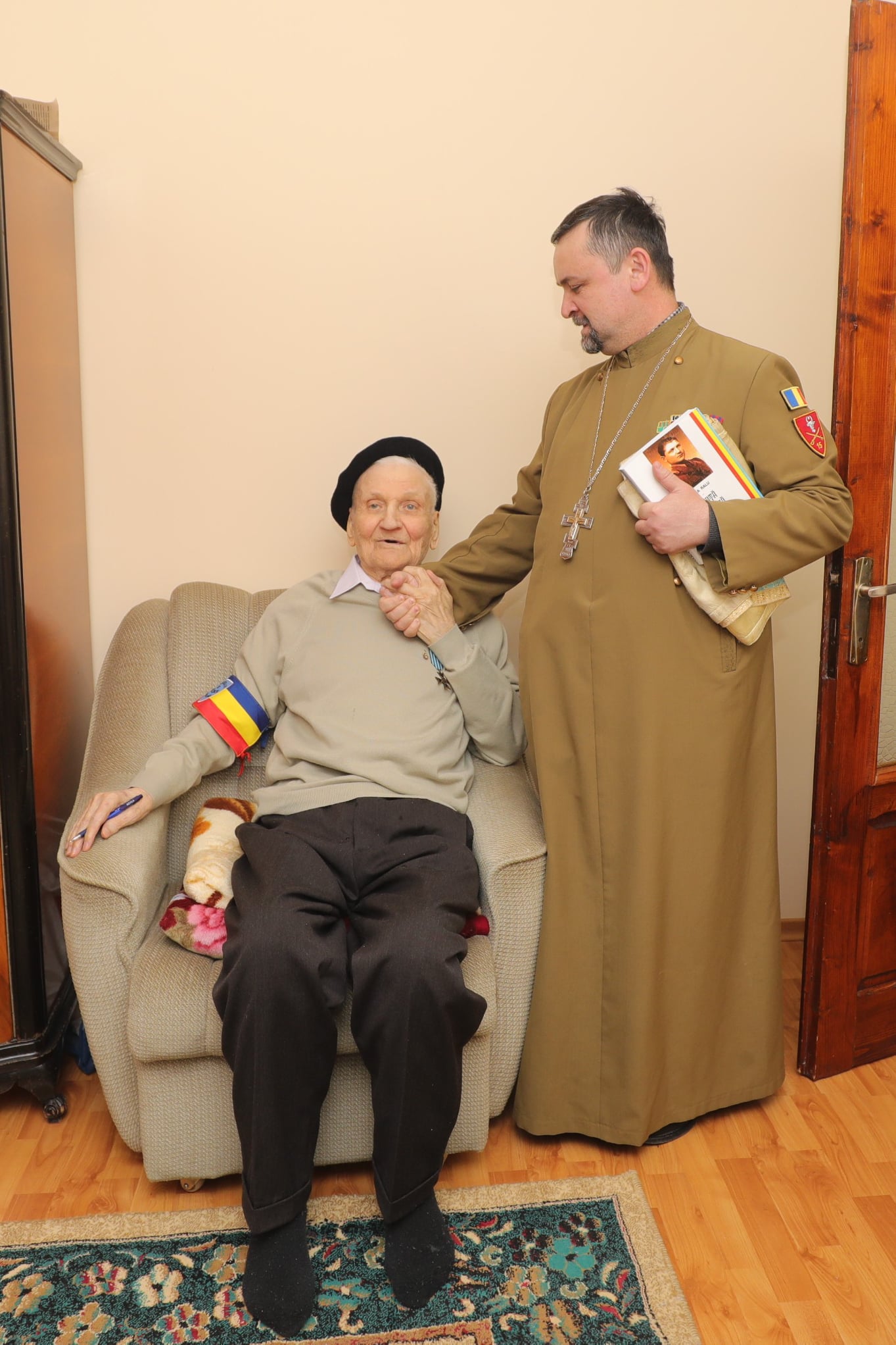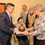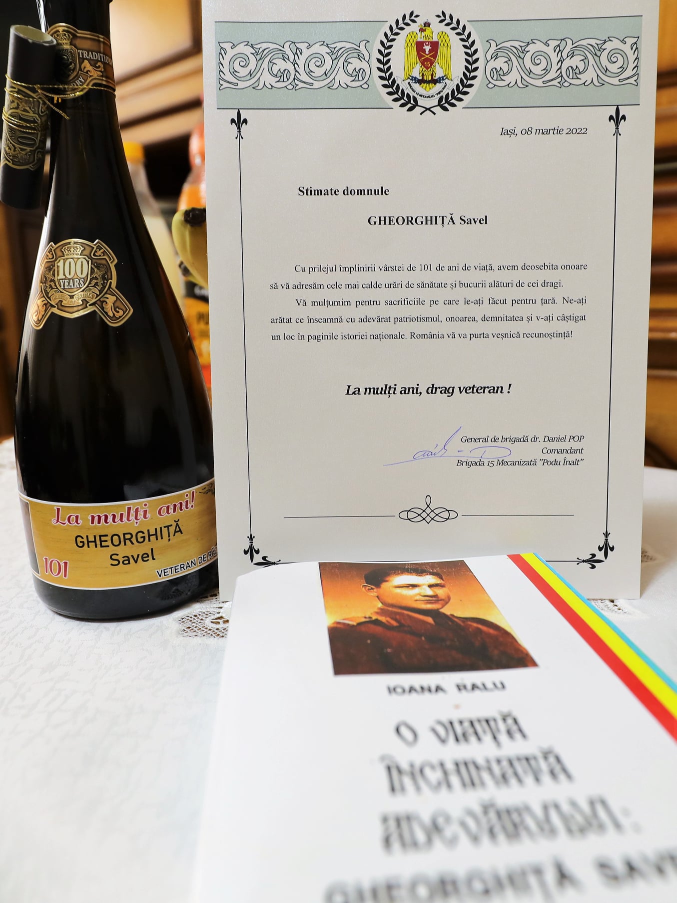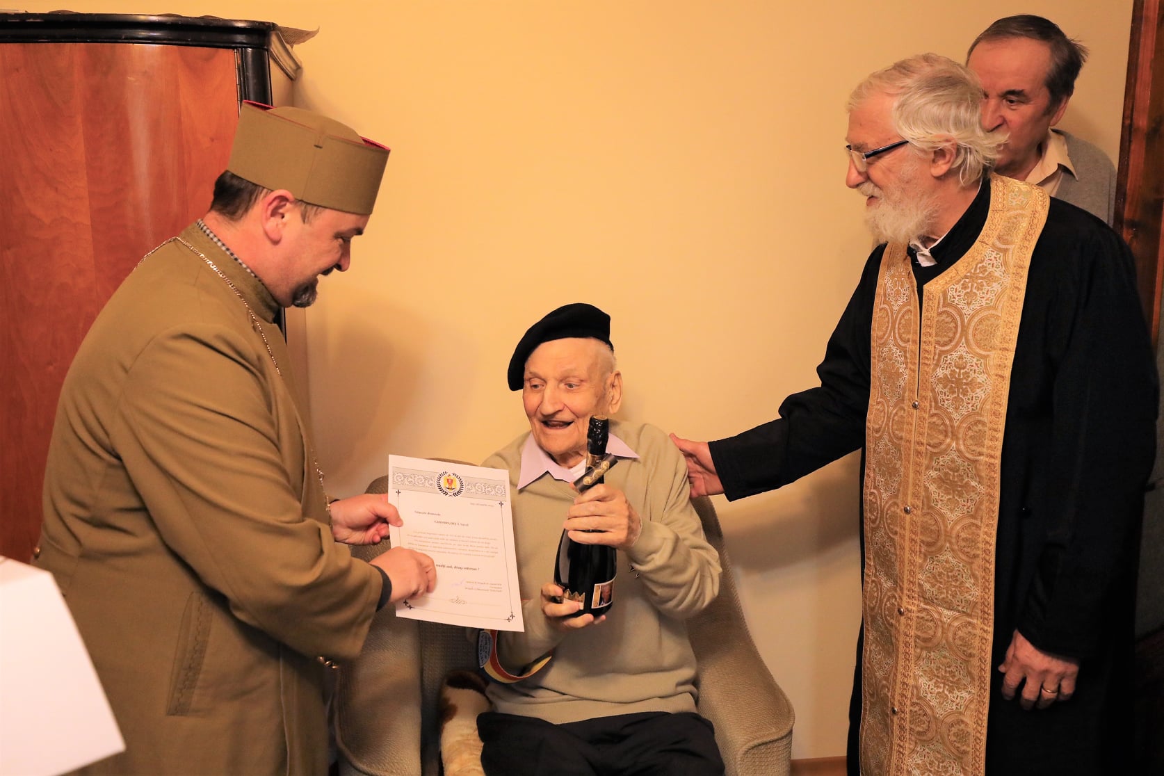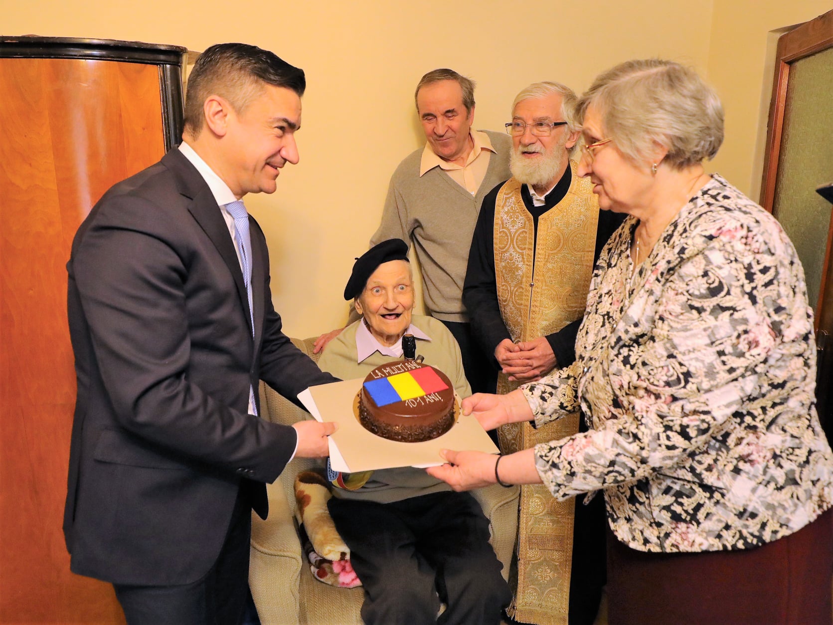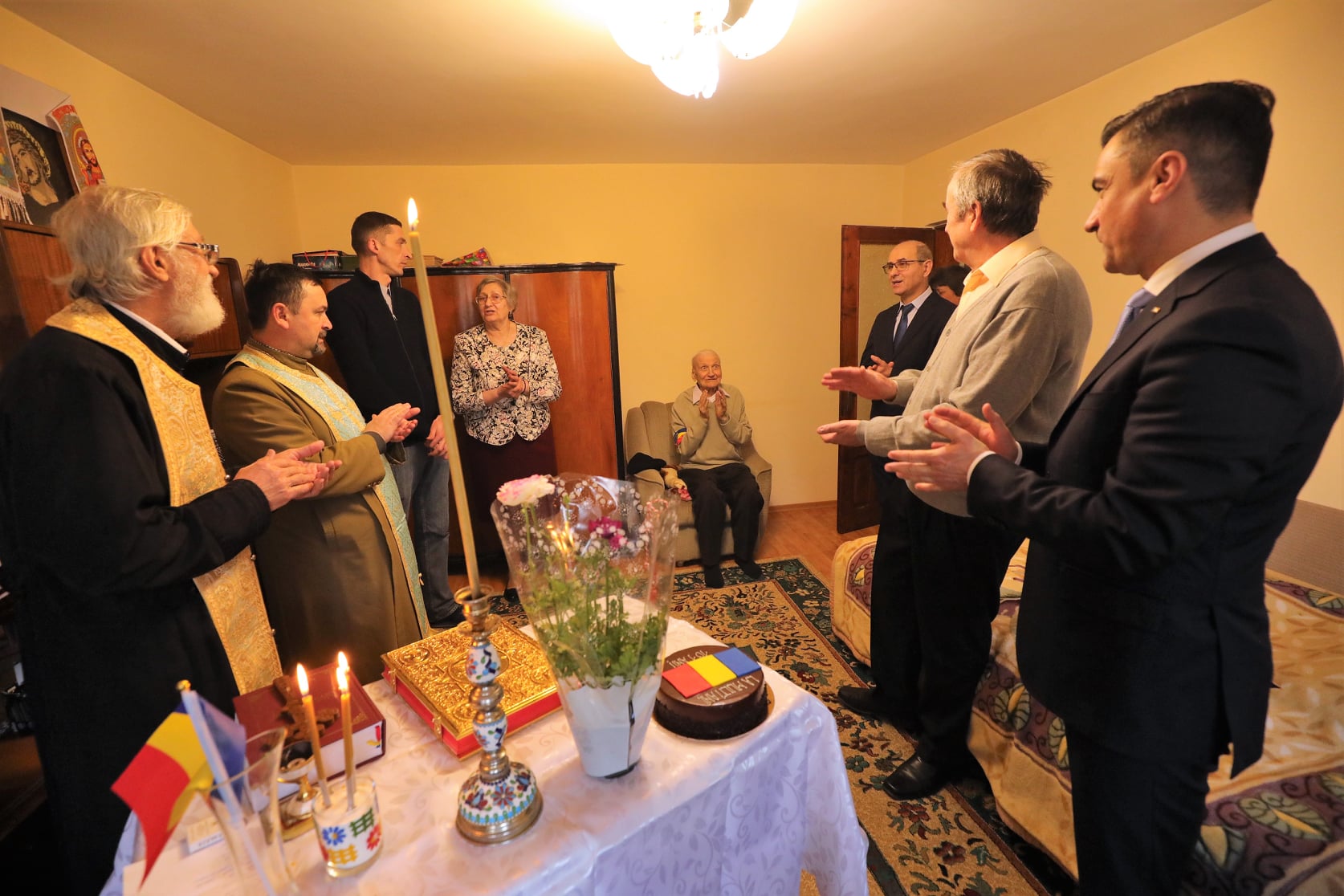 Preotul militar Morțun Adrian, preotul paroh Dumitru Carp, familia Zaharia Nicolae și Liliana precum și primarul municipiului Iași, Mihai Chirica, l-au vizitat pentru a-l felicita cu prilejul aniversării și i-au oferit câteva cadouri simbolice și un tort.