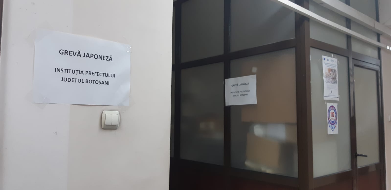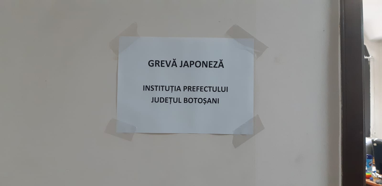 Angajații din Prefectura Botoșani au fost, miercuri, în grevă japoneză. Aceștia nu au întrerupt activitatea, dar au purtat banderole albe pe mâini, fiind nemulțumiți de salarii.