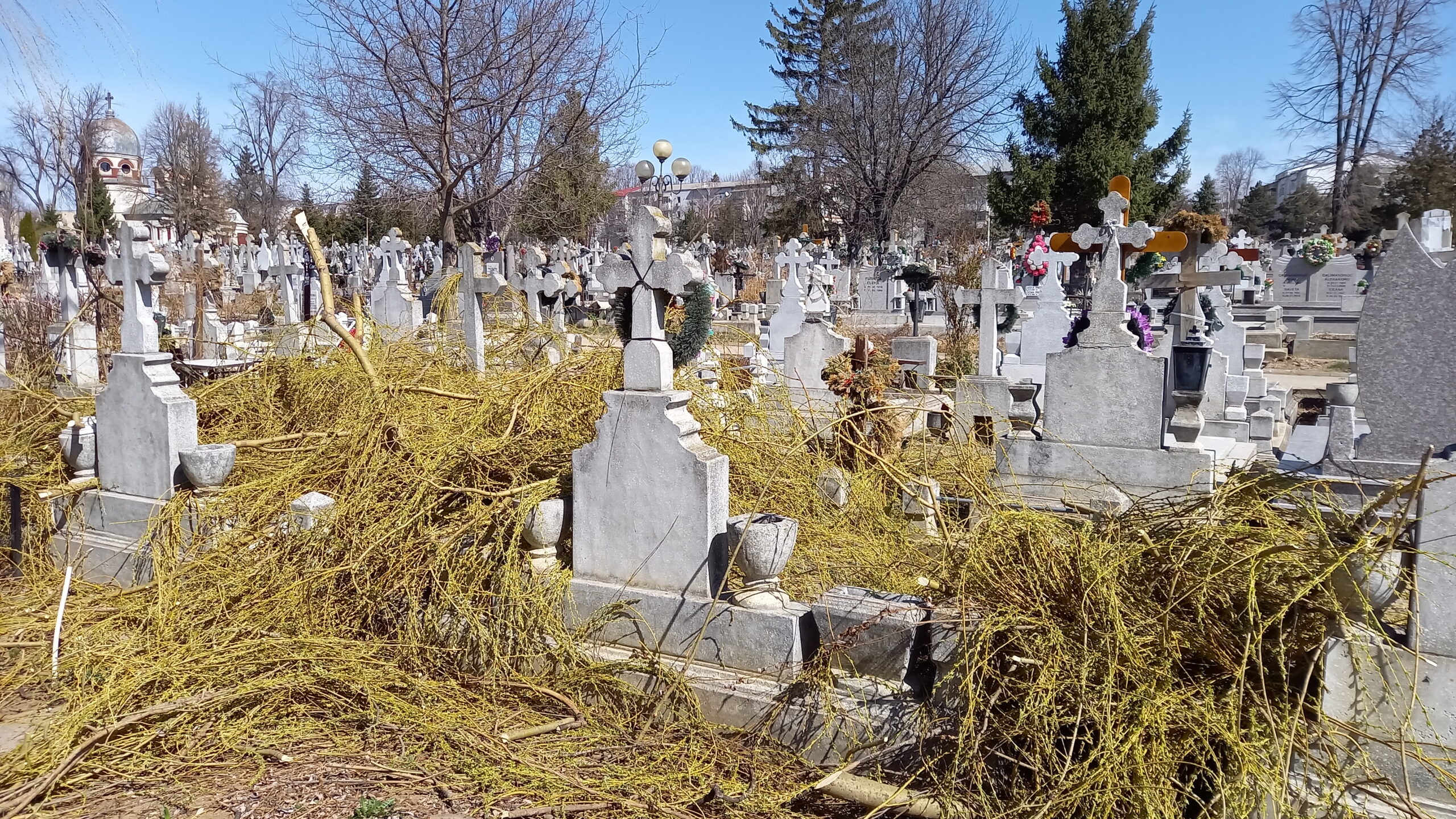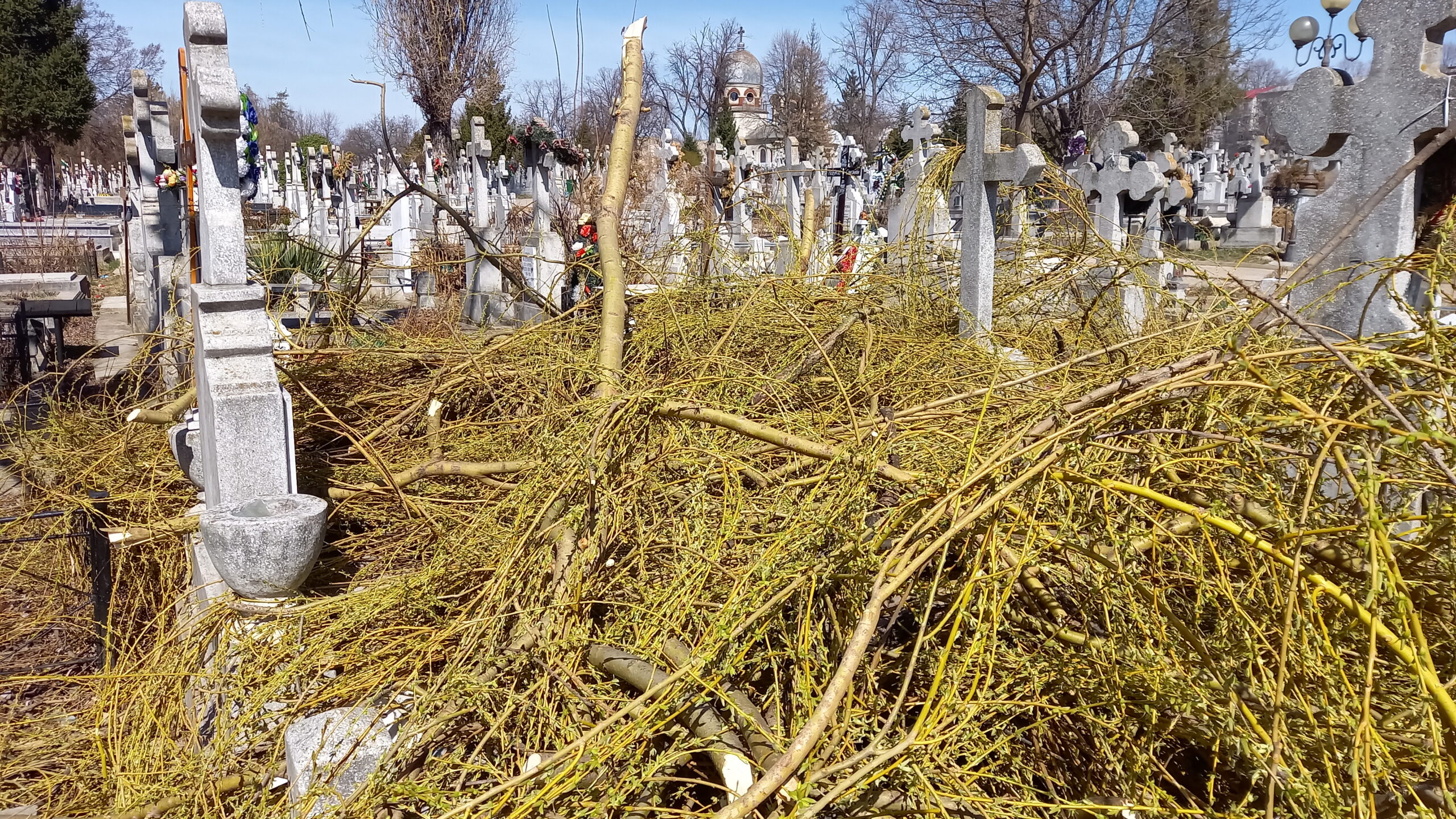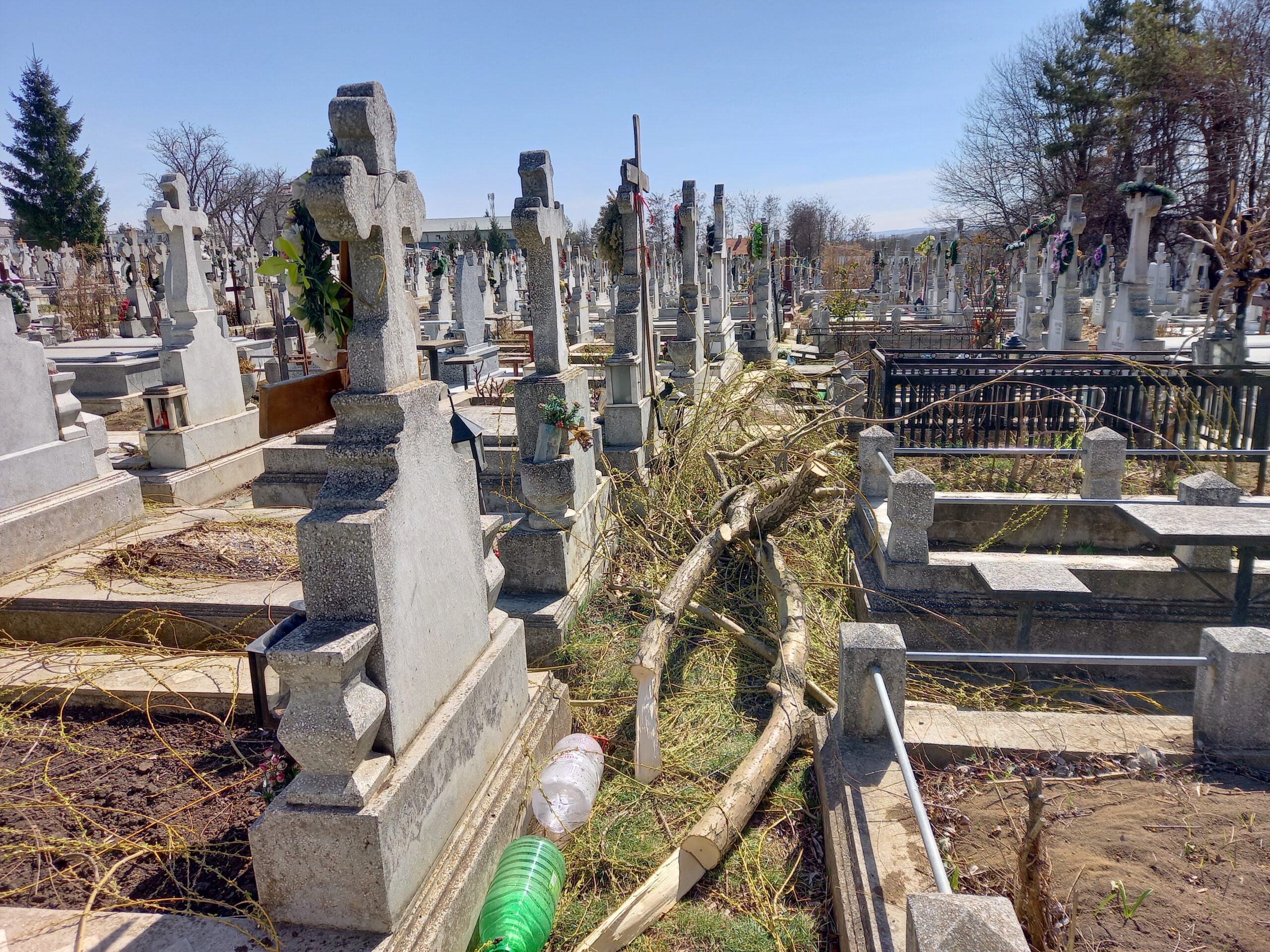 Mai multe morminte din Cimitirul Pacea au fost acoperite de crengi, după ce administratorii cimitirului au tăiat, sâmbătă după-amiază, un copac, fără să țină strângă resturile vegetale și fără să se asigure că monumentele funerare nu au de suferit. Bucățile de crengi au căzut peste cruci, peste felinare și peste morminte, fiind abandonate acolo până duminică.