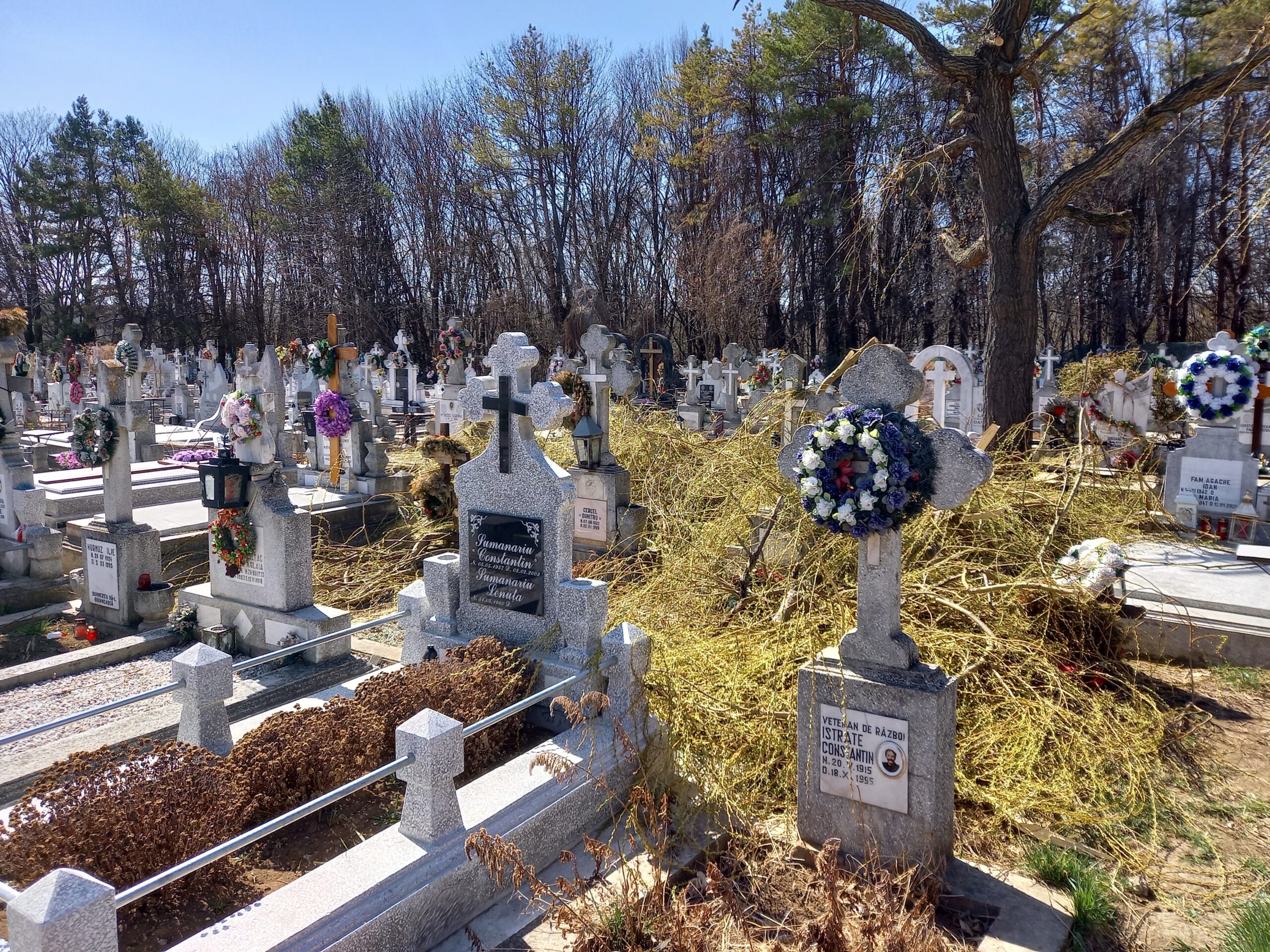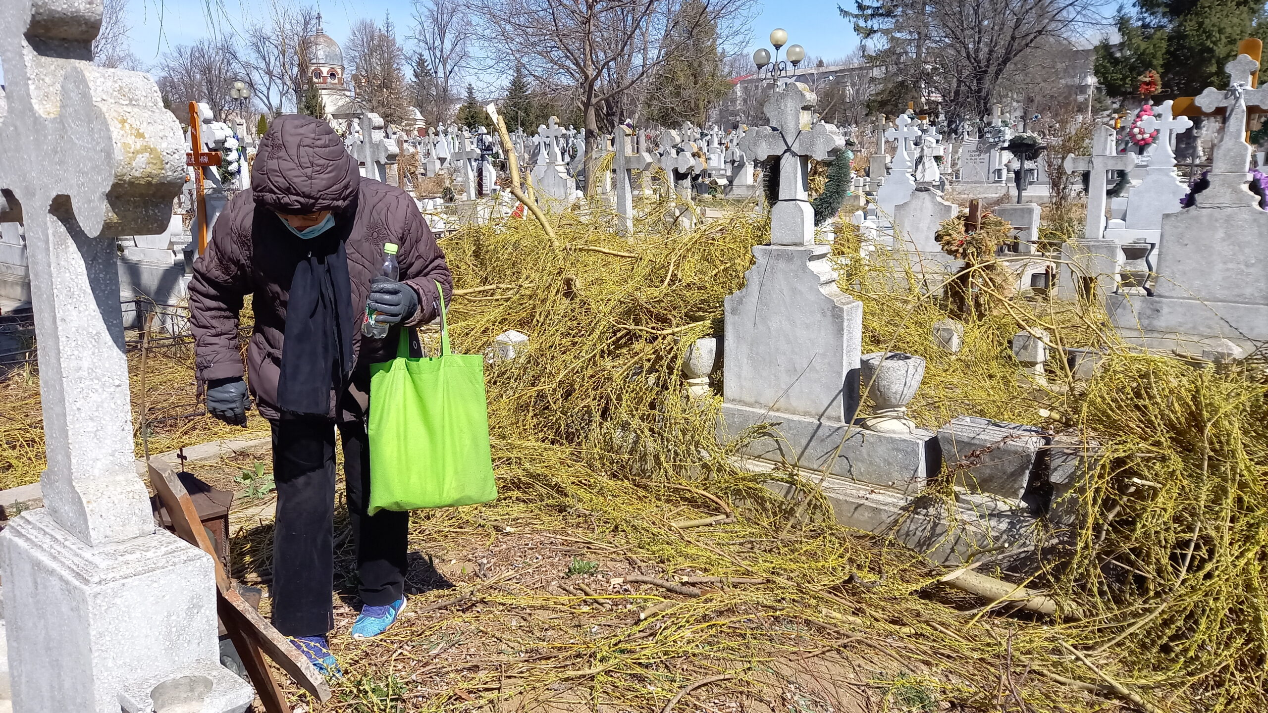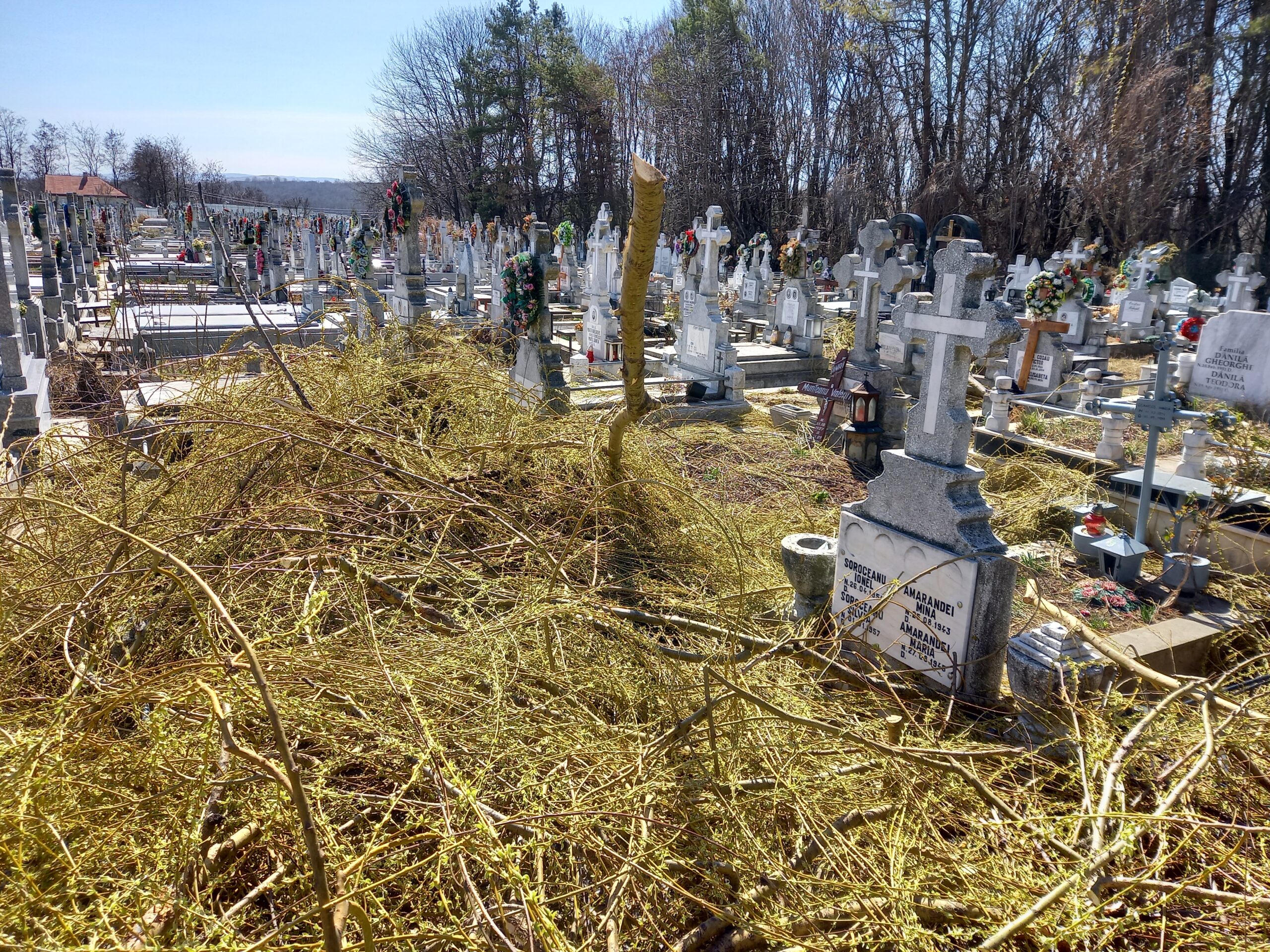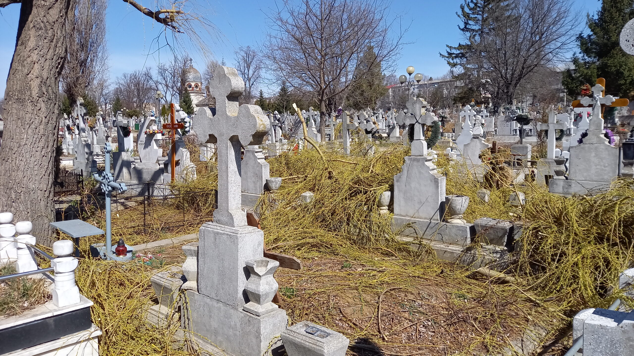 Mai multe morminte din Cimitirul Pacea au fost acoperite de crengi, după ce administratorii cimitirului au tăiat, sâmbătă după-amiază, un copac, fără să țină strângă resturile vegetale și fără să se asigure că monumentele funerare nu au de suferit. Bucățile de crengi au căzut peste cruci, peste felinare și peste morminte, fiind abandonate acolo până duminică.