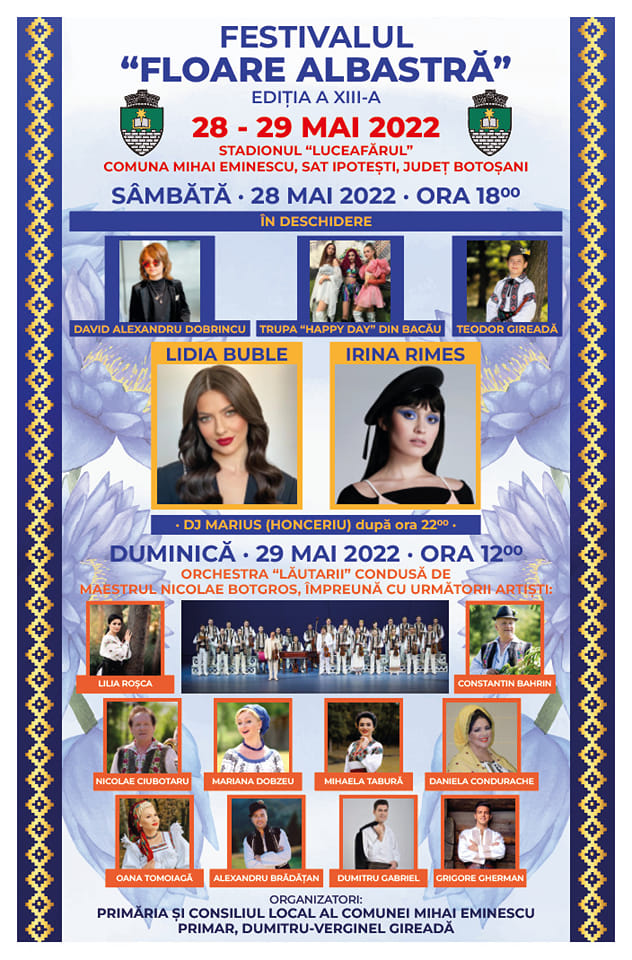 Primăria şi Consiliul Local al comunei Mihai Eminescu organizează în zilele de 28 şi 29 mai 2022 cea de-a XIII – a ediţie a Festivalului Floare Albastră, la stadionul Luceafărul. Evenimentul se organizează de 12 ani, în fiecare lună mai a anului, devenind astfel o tradiţie pentru comuna Mihai Eminescu şi un motiv de sărbătoare pentru locuitorii acesteia.