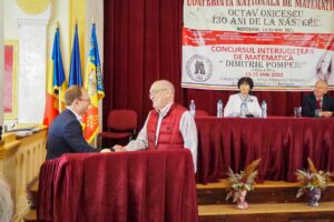 Doi renumiți matematicieni au primit, sâmbătă, plachete din partea primarului municipiului Botoșani, Cosmin Andrei, la „Conferința Națională de Matematică Acad. Octav Onicescu -130 de la naștere”.. Este vorba de profesor univ. dr. Radu Gologan de la Universitatea Politehnica București și professorul Artur Bălăucă – președintele de onoare al Societății de Științe matematice – Filiala Botoșani.