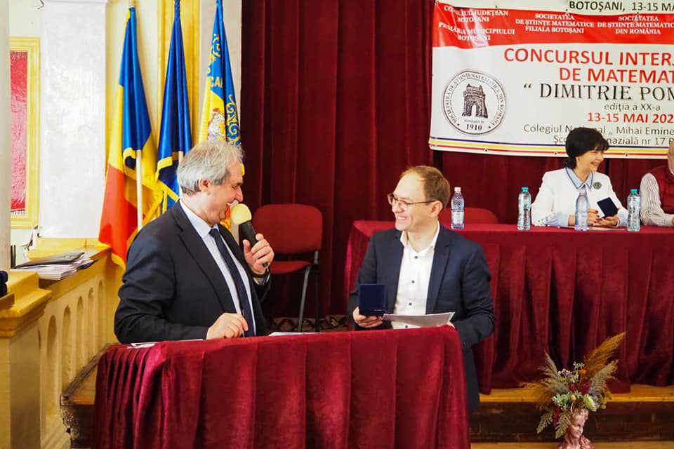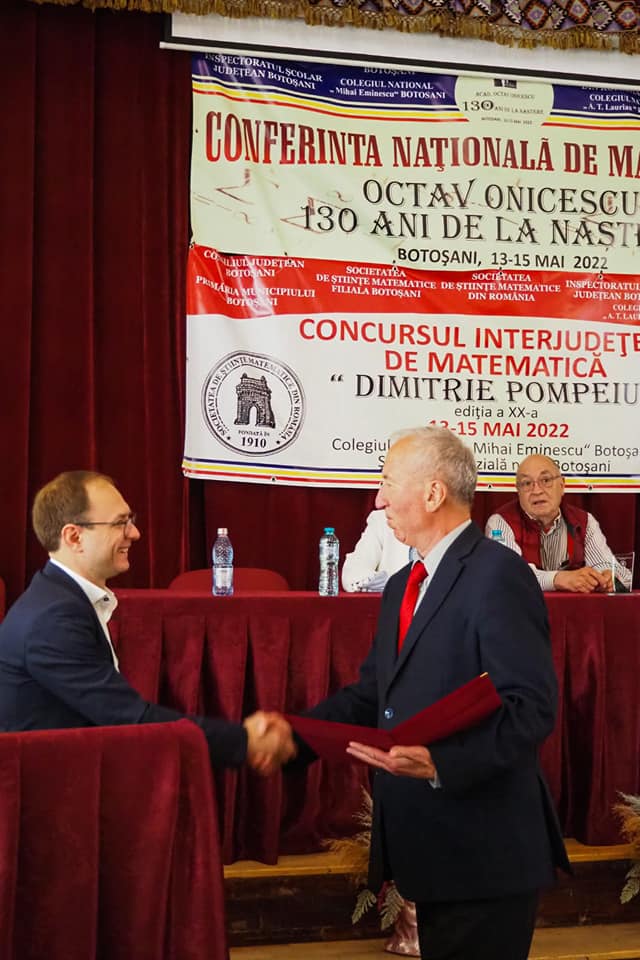 Doi renumiți matematicieni au primit, sâmbătă, plachete din partea primarului municipiului Botoșani, Cosmin Andrei, la „Conferința Națională de Matematică Acad. Octav Onicescu -130 de la naștere”.. Este vorba de profesor univ. dr. Radu Gologan de la Universitatea Politehnica București și professorul Artur Bălăucă – președintele de onoare al Societății de Științe matematice – Filiala Botoșani.