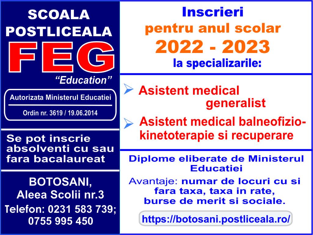 Școala Postliceală FEG „Education” Botoșani, autorizată de Ministerul Educației, face înscrieri pentru anul școlar 2022- 2023 pentru specializările de asistent medical generalist sau asistent balneo-fizio-kinetoterapie și recuperare.