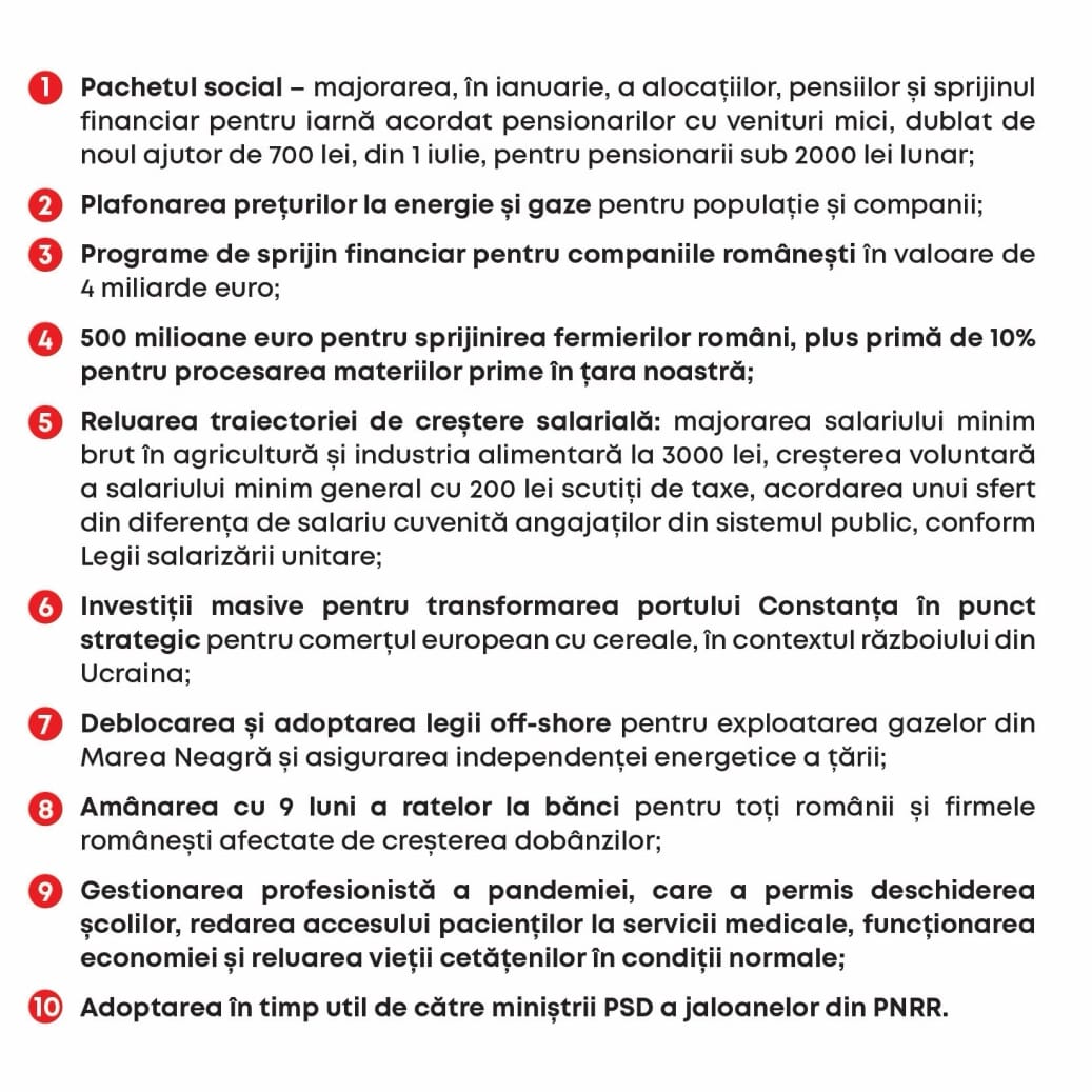 În cele 6 luni de când PSD face parte din echipa guvernamentală, au fost implementate și adoptate o serie de măsuri argumentate de PSD în cadrul Coaliției, măsuri care îi ajută pe românii care nu mai puteau face față cheltuielilor și creșterilor de prețuri la energie, alimente, combustibil, iar în cazul antreprenorilor să plătească salariile și să se mențină pe piață.
