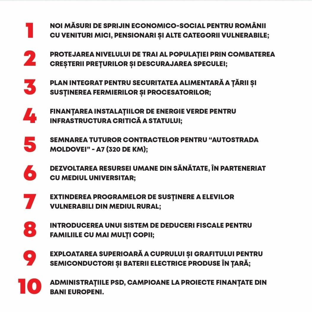 PSD va rămâne în continuare preocupat să refacă echilibrele economice și puterea de cumpărare a populației și va iniția permanent măsuri în fiecare domeniu pe care îl gestionează, chiar dacă măsurile, programele, convingerile și valorile PSD pot diferi de cele ale partenerilor de Coaliție.