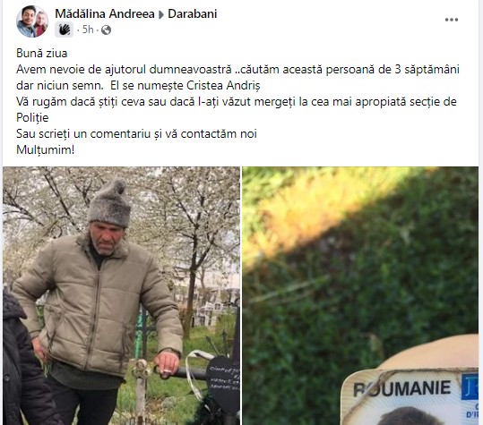 „Avem nevoie de ajutorul dumneavoastră ..căutăm această persoană de 3 săptămâni dar niciun semn. El se numește Cristea Andriș. Vă rugăm dacă știți ceva sau dacă l-ați văzut mergeți la cea mai apropiată secție de Poliție”, este mesajul Mădălinei Andreea.