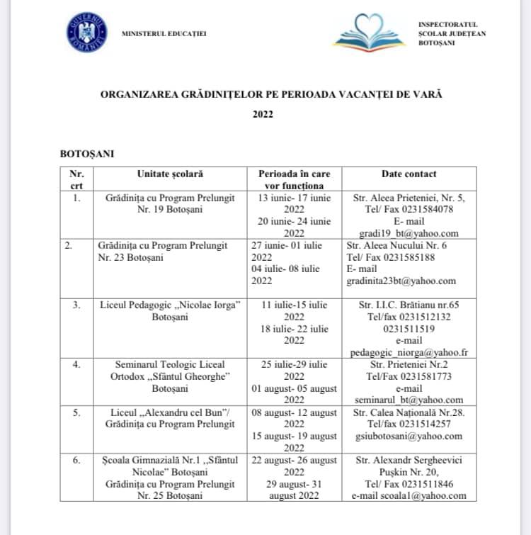 Inspectoratul Școlar Județean (ISJ) Botoșani a anunţat programul grădiniţelor care vor fi deschise în perioada vacanţei de vară. Toate grădinițele cu program prelungit vor fi deschise, potrivit unui anunț al ISJ.