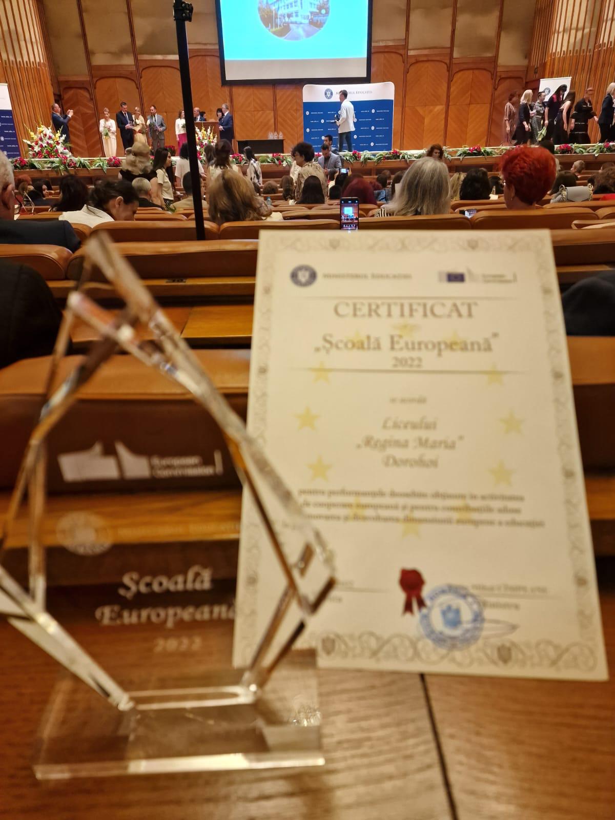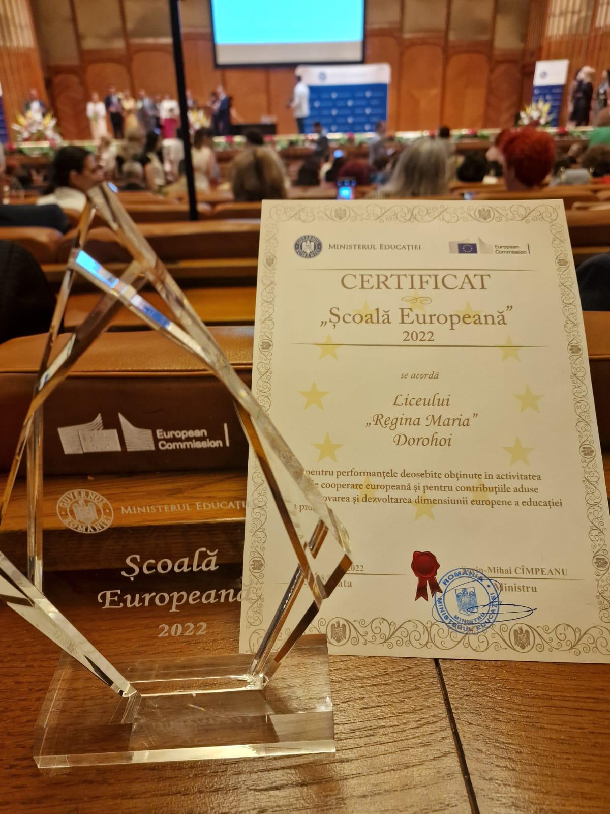 Miercuri, 8 iunie 2022, la Palatul Parlamentului, într-un cadru festiv, a avut loc premierea școlilor câștigătoare ale competiției “Școală Europeană”. În premieră, ministrul Educației, prof. univ. dr. Sorin Mihai Câmpeanu, a înmânat trofeul și celor două scoli premiate din județul Botoșani: Liceul “Regina Maria” Dorohoi și Școala Gimnazială nr. 10 Botoșani.