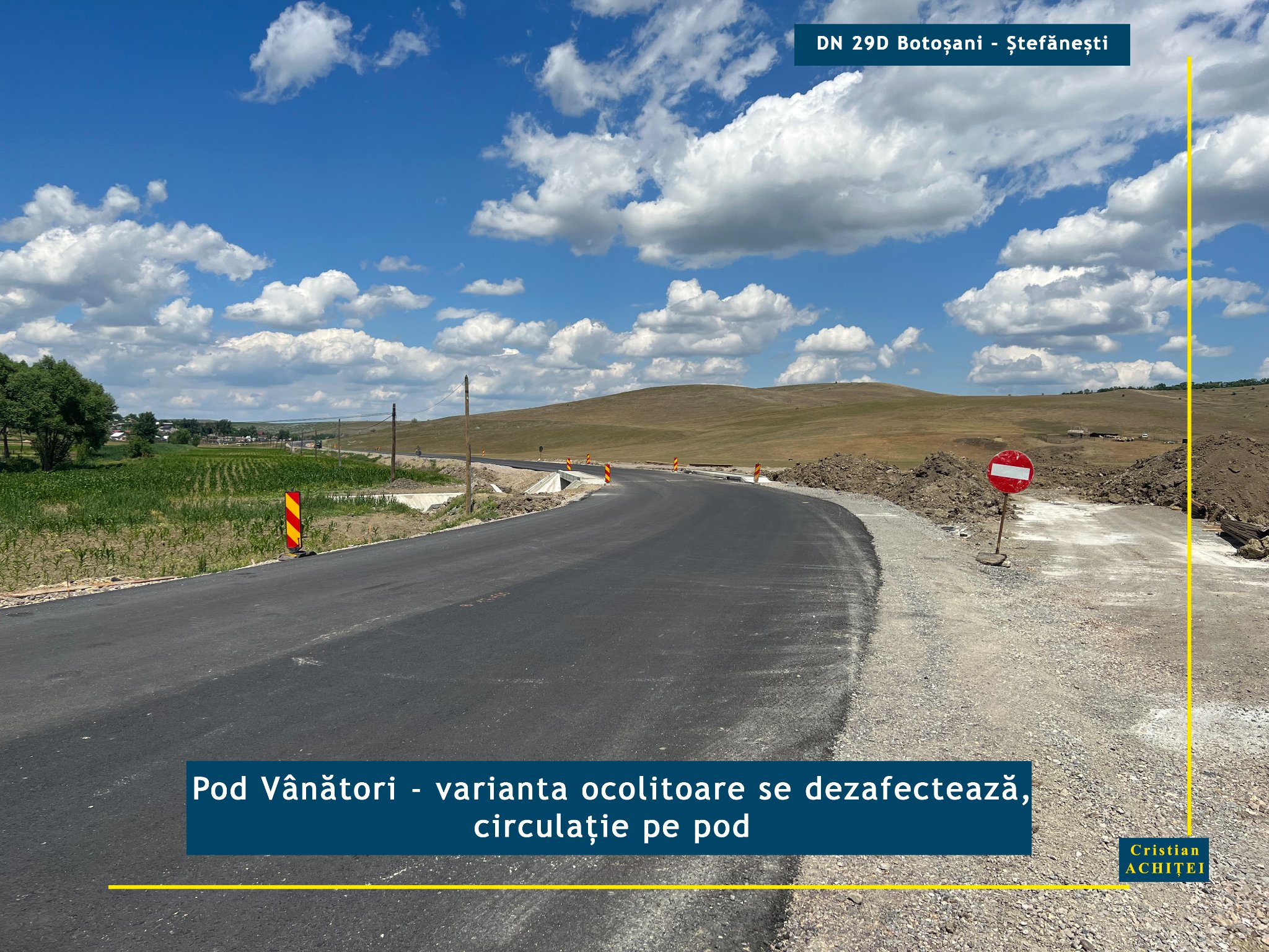 Execuția lucrărilor de modernizare a drumului național DN 29 D Botoșani- Ștefănești progresează substanțial de la lună la lună, susţine senatorul liberal Cristian Achiţei. Într-o postare pe Facebook, parlamentarul PNL susţine că în urma vizitelor pe teren a constat că primul și chiar al doilea strat de asfalt a fost turnat pe mai multe tronsoane, că mai multe poduri noi au fost date în circulație, variantele ocolitoare fiind dezafectate, dar şi că se lucrează la casetele de lărgire a drumului și la refacerea sistemului rutier pe noi tronsoane abordate în forță de constructor.