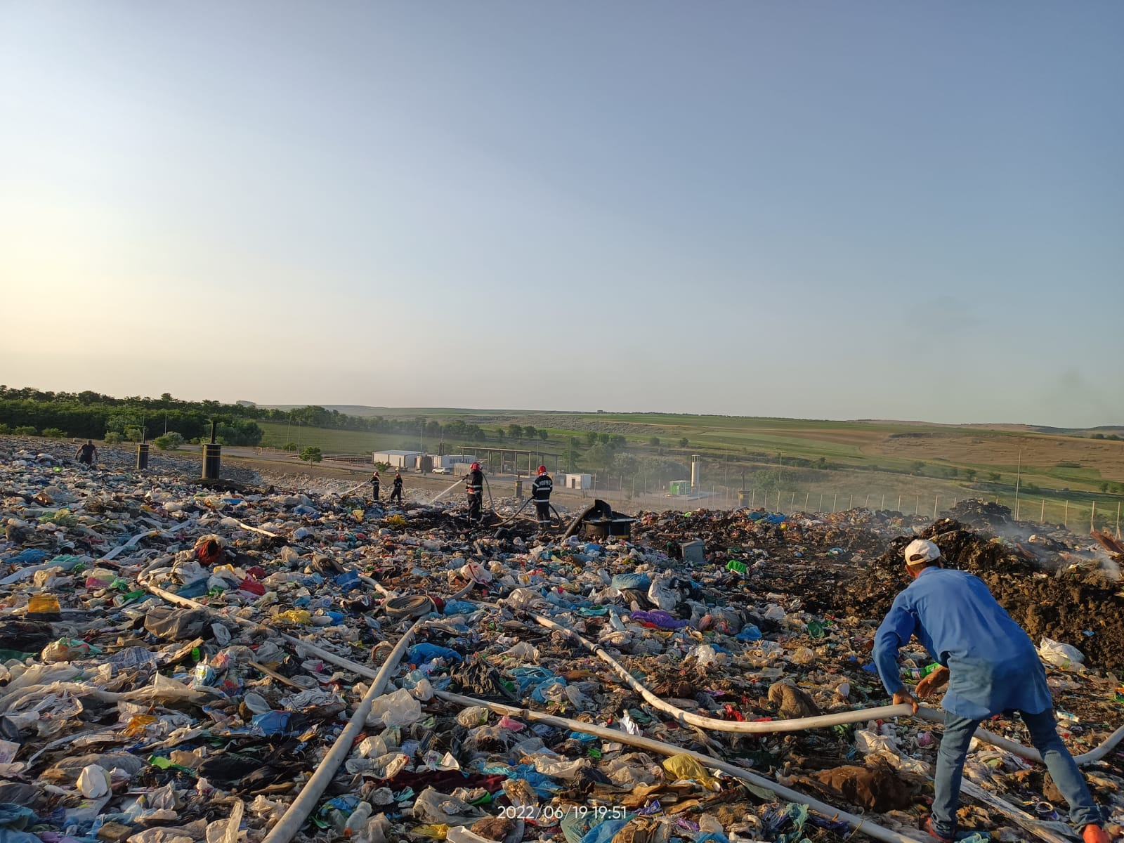 Pompierii botoșăneni acționează, duminică seară, pentru stingerea unui incendiu care a izbucnit în interiorul depozitului ecologic de deșeuri de la Stăuceni.