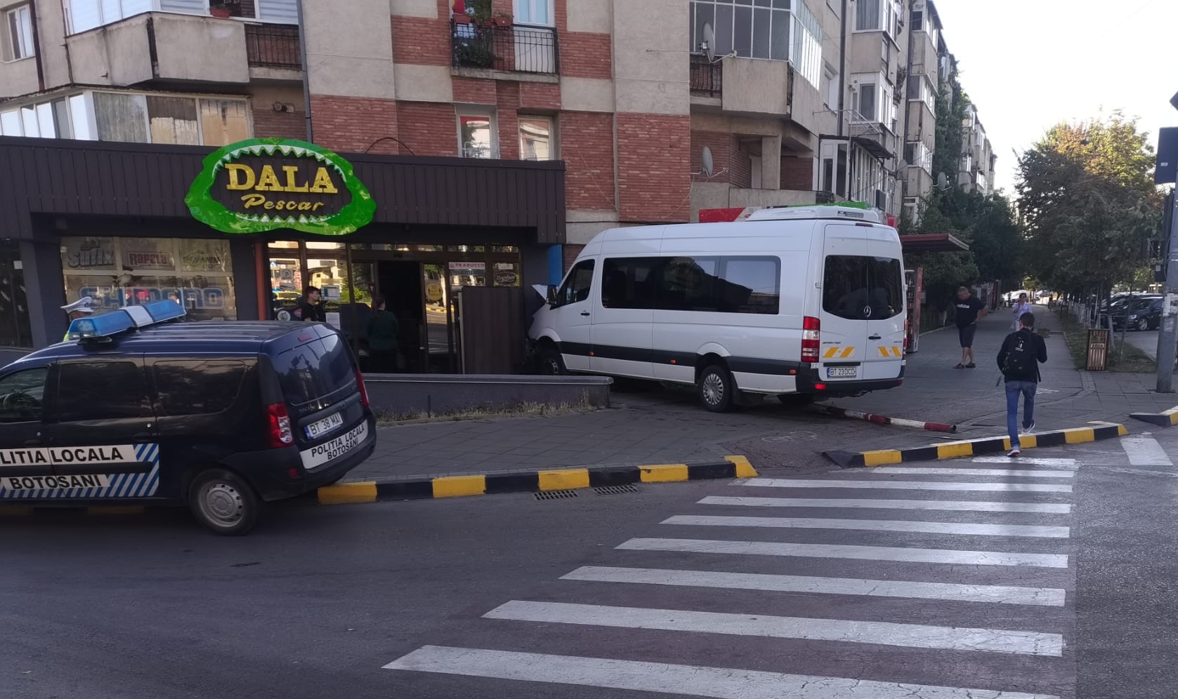 Un accident rutier s-a produs, vineri dimineață, la intersecția dintre Calea Națională și strada Octav Onicescu. Un microbuz al societății comerciale Doly Com a intrat în peretele magazinului pescăresc, Șoferul circula pe Calea Națională dinspre Stadion spre Centru, însă în intersecția cu Octav Onicescu a intrat într-o coliziune ușoară cu o Mazda care cobora pe Octav Onicescu și care nu a acordat prioritate.. Șoferul microbuzului a tras stânga de volan, a urcat pe trotuar și s-a oprit în magazin.
