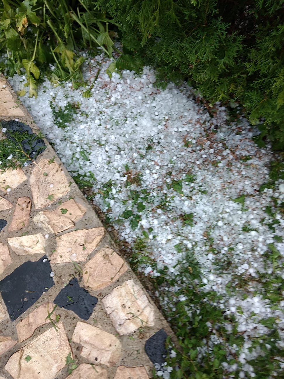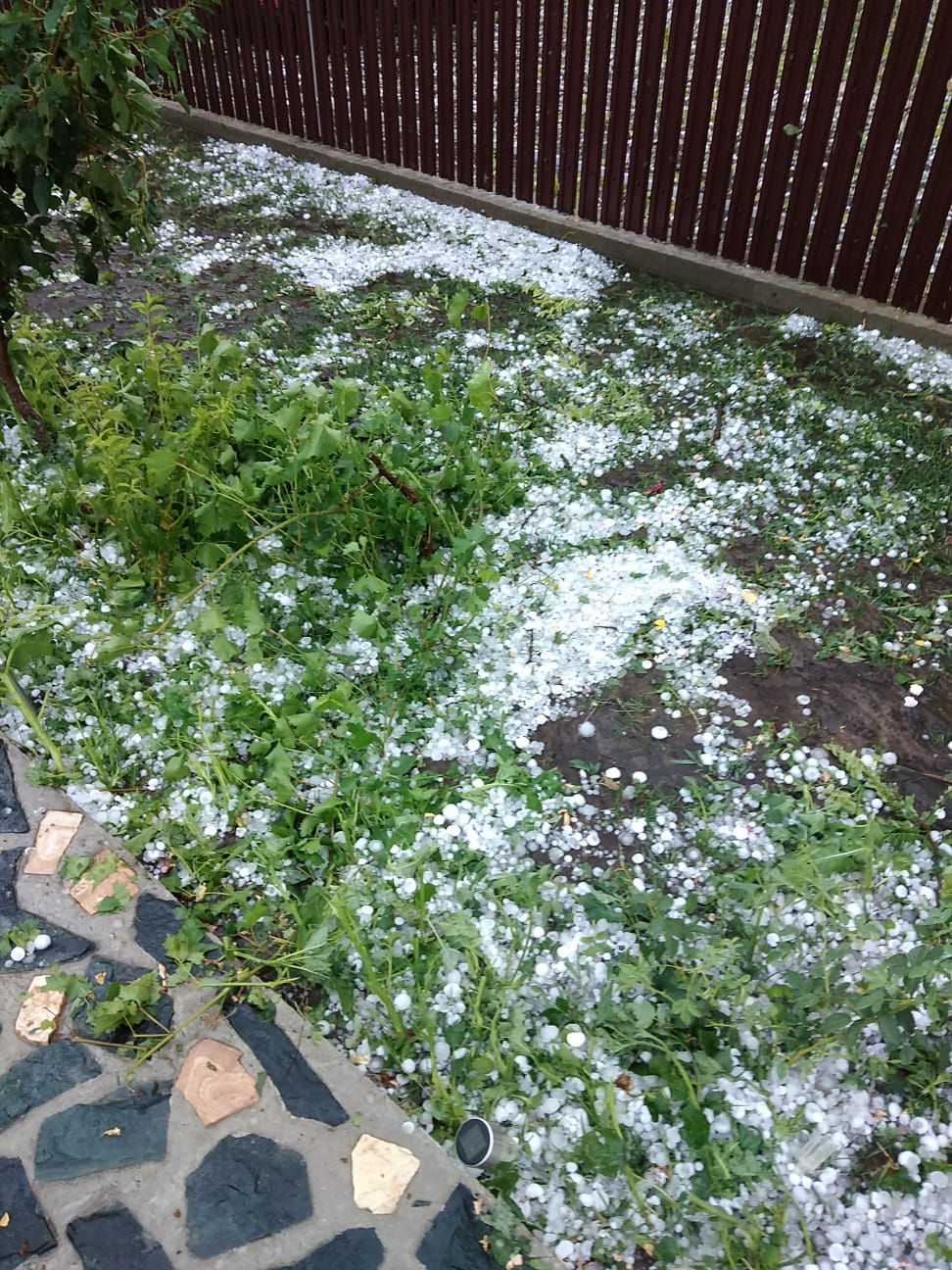 Localnicii susţin că ploile nu au fost prea puternice, undeva la 27 litri/metru pătrat, însă gheaţa care a căzut minute bune a creat pagube semnificative.