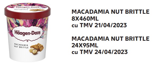 Un nou tip de înghețată a fost retras de la comercializare din hipermarketul Kaufland. General Mills efectuează rechemare voluntară a produselor de înghețată Häagen-Dazs: Macadamia Nut Brittle 8X460ML; Macadamia Nut Brittle 24X95ML.