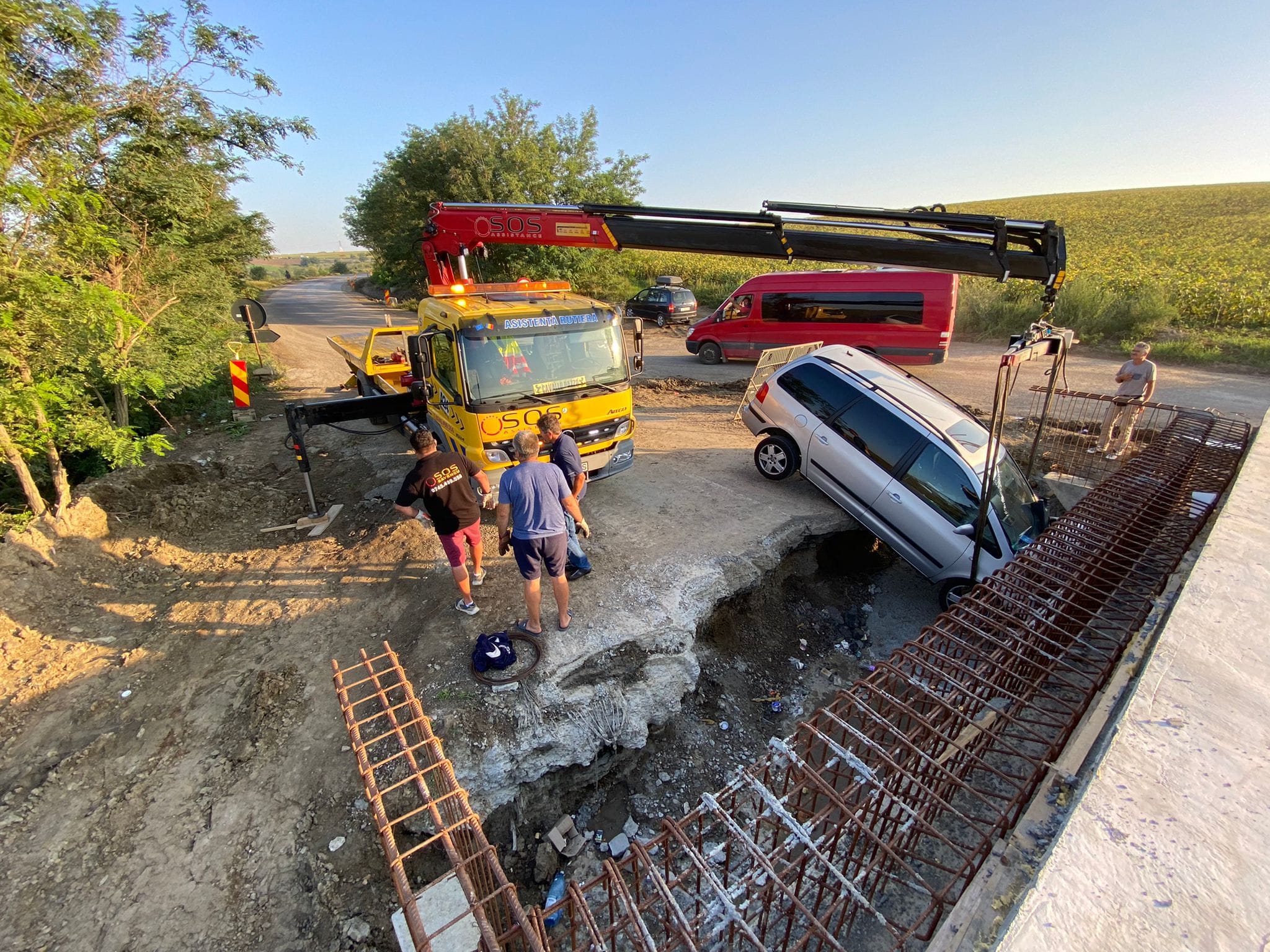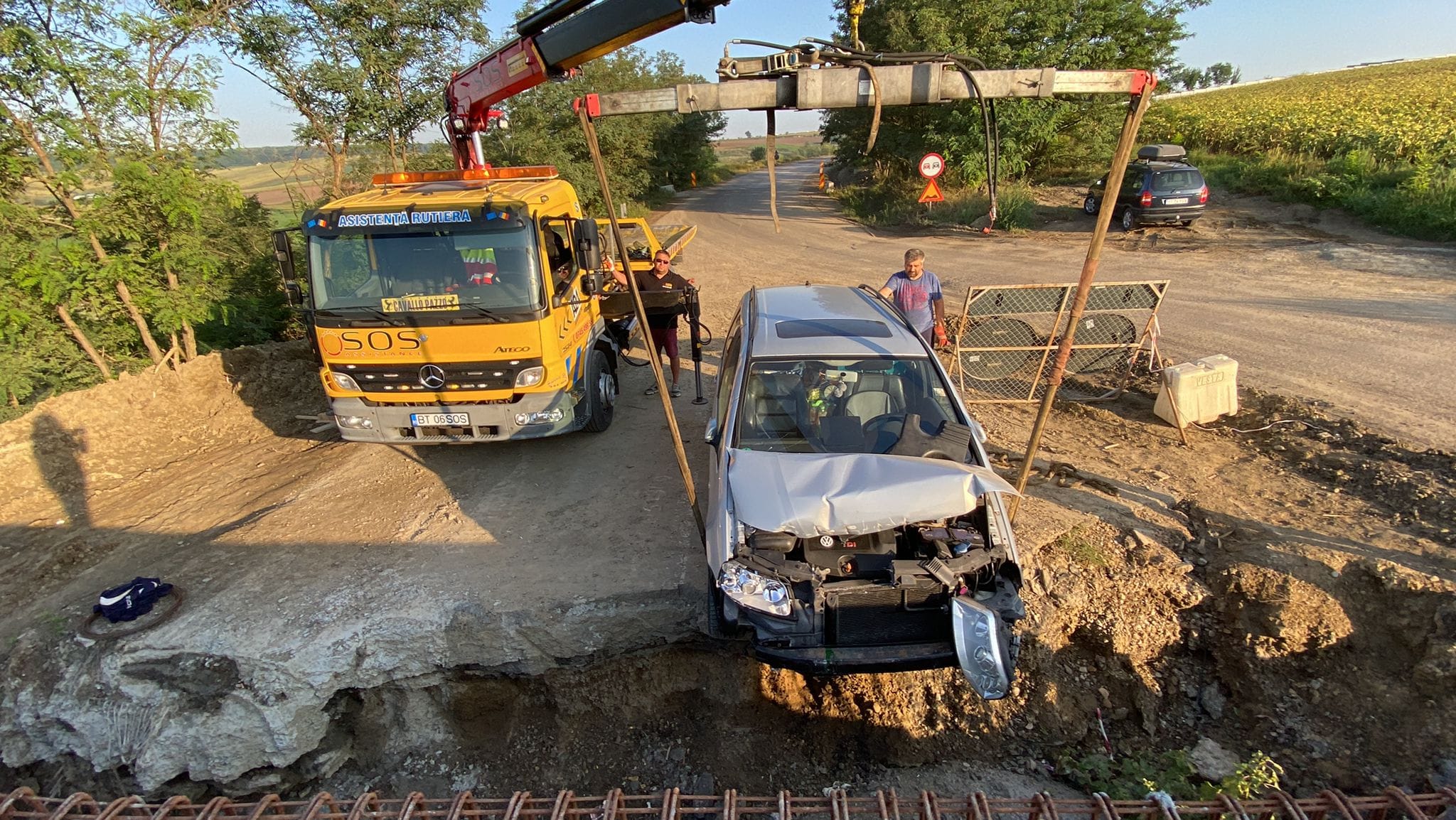FOTO Accident pe șantierul de pe DN 29D. Mașină suspendată în zona în care se construiește un viaduct