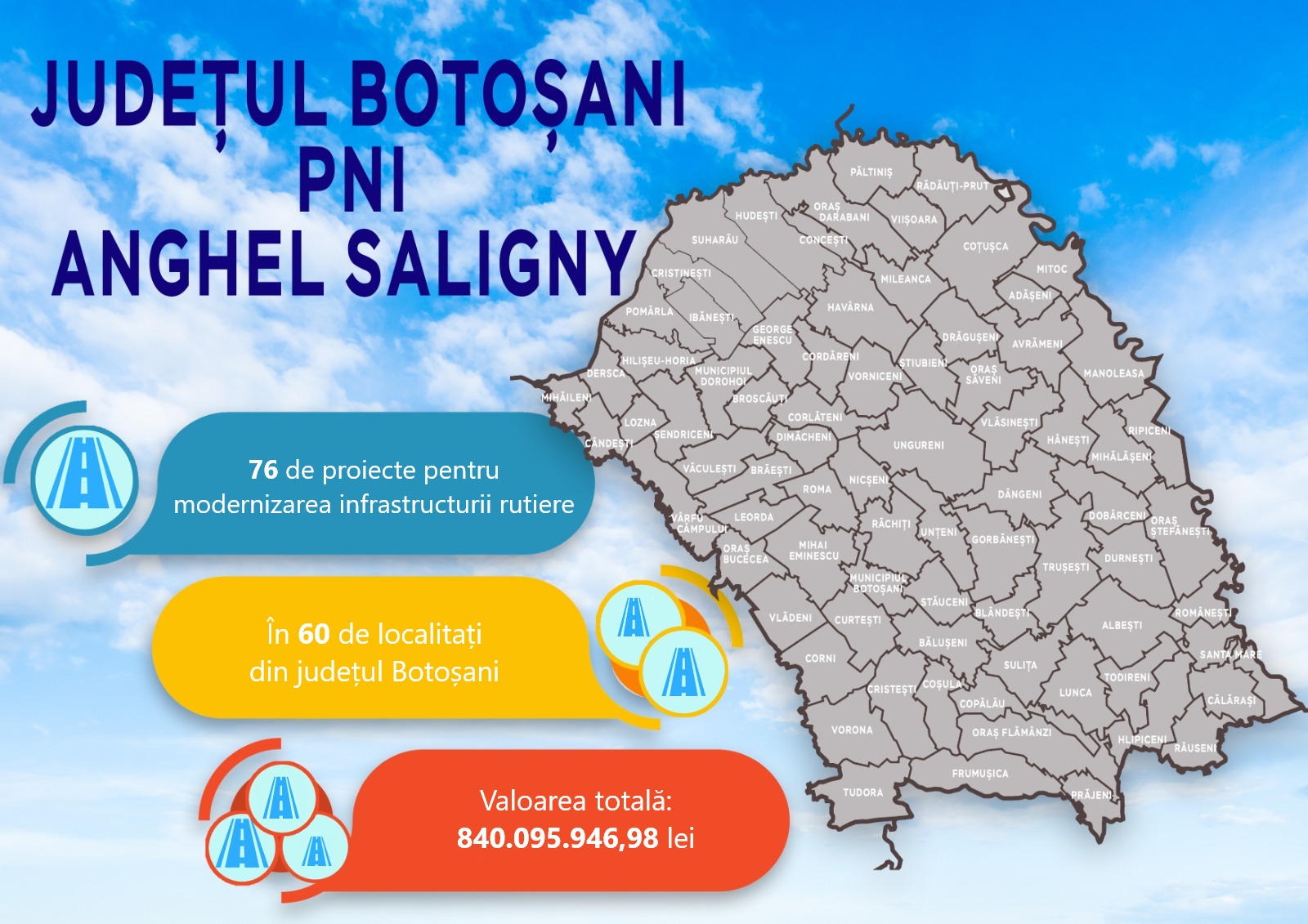 „Avem nevoie în special de investiții în dezvoltarea infrastructurii rutiere, care este încă deficitară în județul nostru. De aceea, am susținut decizia Guvernului de suplimentare a fondurilor pentru programul Anghel Saligny, cu 15,5 miliarde de lei, din care 10 miliarde pentru construcția și modernizarea drumurilor astfel încât, fără excepție, indiferent de culoarea politică a primarului, să fie finanțate toate proiectele depuse de comunitățile locale. În prezent, în Botoșani avem aprobate 76 de proiecte depuse de autoritățile locale ce vizează modernizarea infrastructurii rutiere în 60 de localități, unele cu două sau mai multe proiecte, 5 proiecte la Consiliul Județean și 8 în municipiul Botoșani”, a declarat Dan Șlincu.