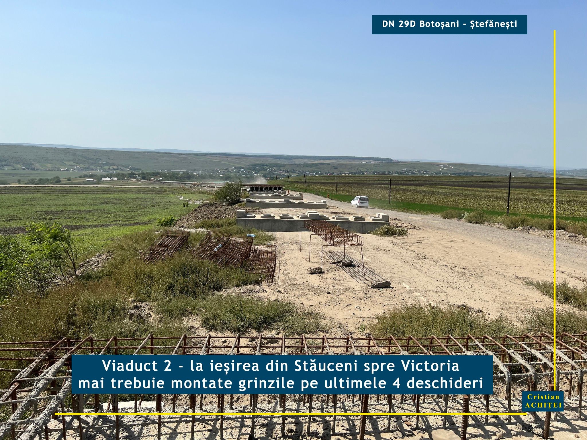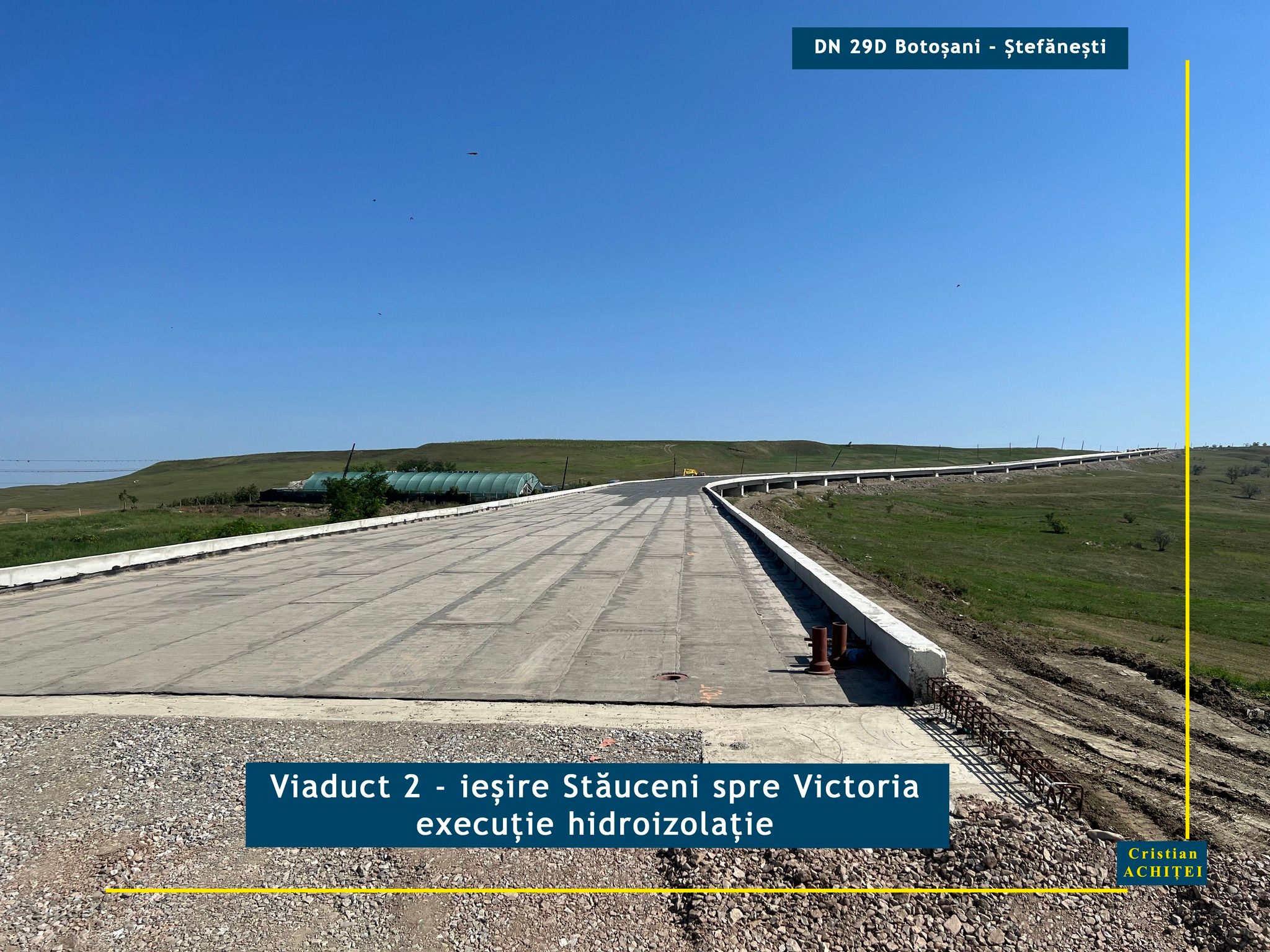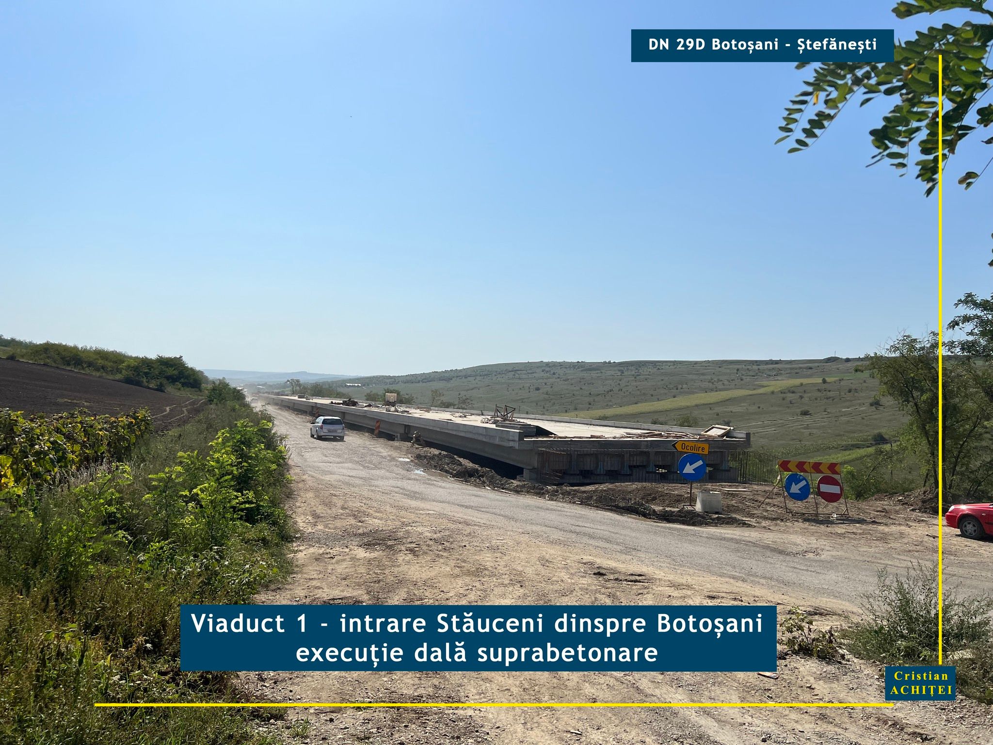 Senatorul Cristian Achiței supervizează lucrările pe drumurile de importanță majoră din județul Botoșani. Parlamentarul discută cu constructorii, merge la fața locului și deocamdată se declară mulțumit de modul în care decurge modernizarea DN 29 D Botoșani- Ștefănești. Potrivit acestuia, constructorul lucrează intens la execuția viaductelor de la intrarea și ieșirea din Stăuceni. La primul dintre acestea, cel dinspre municipiul Botoșani, a mai rămas o singură deschidere între coloanele de susținere pe care mai trebuie puse grinzi. Pe întreaga lungime a viaductului se execută dalele de suprabetonare.