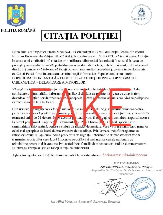 „Niciodată nu este prea târziu să ne protejăm de tot ce înseamnă FAKE! #PolițiaRomână nu trimite astfel de mail-uri! Recomandăm să nu dați importanță unor astfel de mesaje, mail-uri sau orice altă abordare similară. Sesizați-ne dacă ați suferit vreo vătămare a intereselor legitime.