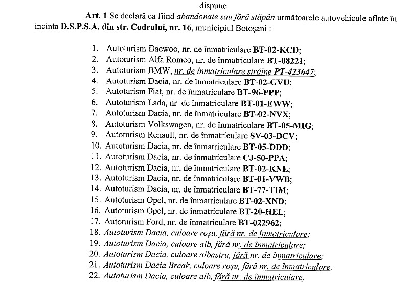 Pe lista mașinilor care devin proprietate publică și care vor fi valorificate la fier vechi se află 12 autoturisme Dacia, două Opel, un Renault, un BMW, un Fiat, un Ford, un Daewoo Cielo, un Volkswagen, un Alfa Romeo și unul Lada. Iată mai jos lista completă a mașinilor declarate abandonate sau fără stăpân, cu numere de înmatriculare, acolo unde este cazul: